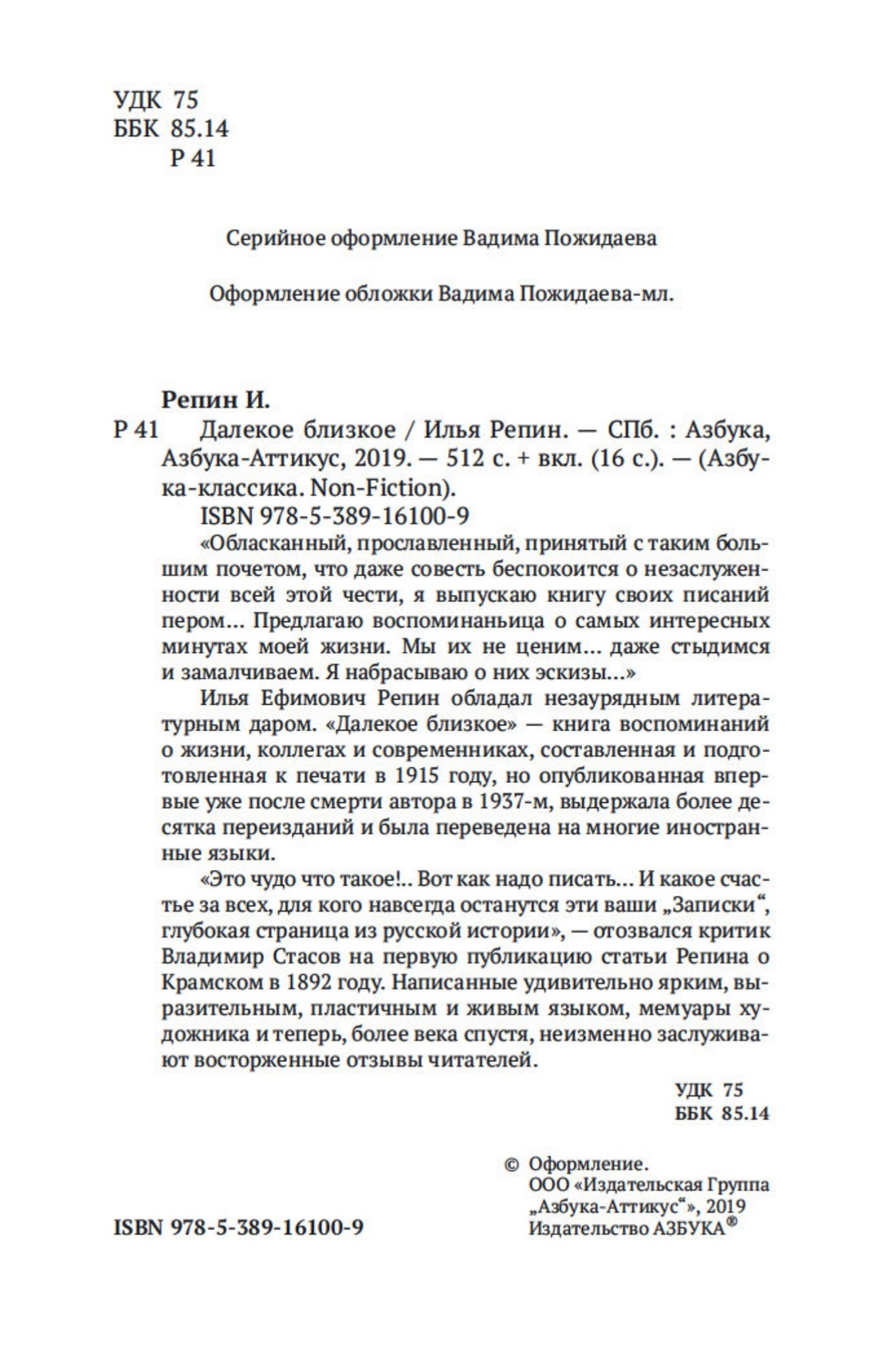 Илья Ефимович Репин обладал незаурядным литературным даром. «Далекое близкое» – книга воспоминаний о жизни, коллегах и современниках, составленная и подготовленная к печати в 1915 году, но опубликованная впервые уже после смерти автора в 1937-м, выдержала более десятка переизданий и была переведена на многие иностранные языки.