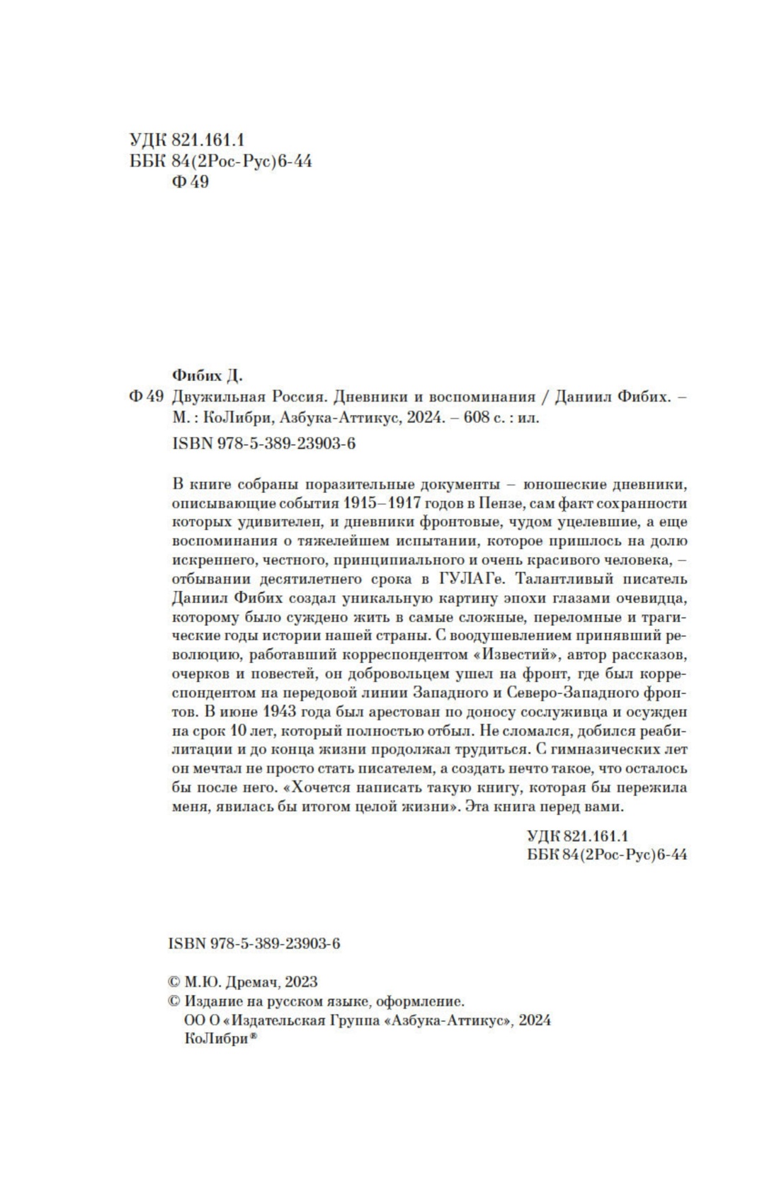 В книге собраны поразительные документы – юношеские дневники, описывающие события 1915-1917 гг. в Пензе сам факт сохранности которых удивителен и дневники фронтовые, чудом уцелевшие, а еще воспоминания о тяжелейшем испытании, которое пришлось на долю искреннего, честного, принципиального и очень красивого человека – отбывании десятилетнего срока в ГУЛАГе. Талантливый писатель Даниил Фибих создал уникальную картину эпохи глазами очевидца, которому было суждено жить в самые сложные, переломные и трагические годы истории нашей страны. С воодушевлением принявший революцию, работавший корреспондентом «Известий», автор рассказов, очерков и повестей, он добровольцем ушел на фронт, где был корреспондентом на передовой линии Западного и Северо-Западного фронта. В июне 1943 году был арестован по доносу сослуживца и осужден на срок 10 лет, который полностью отбыл. Не сломался, добился реабилитации и до конца жизни продолжал трудиться. С гимназических лет он мечтал не просто стать писателем, а создать нечто такое, что осталось бы после него. «Хочется написать такую книгу, которая бы пережила меня, явилась бы итогом целой жизни». Эта книга перед вами.