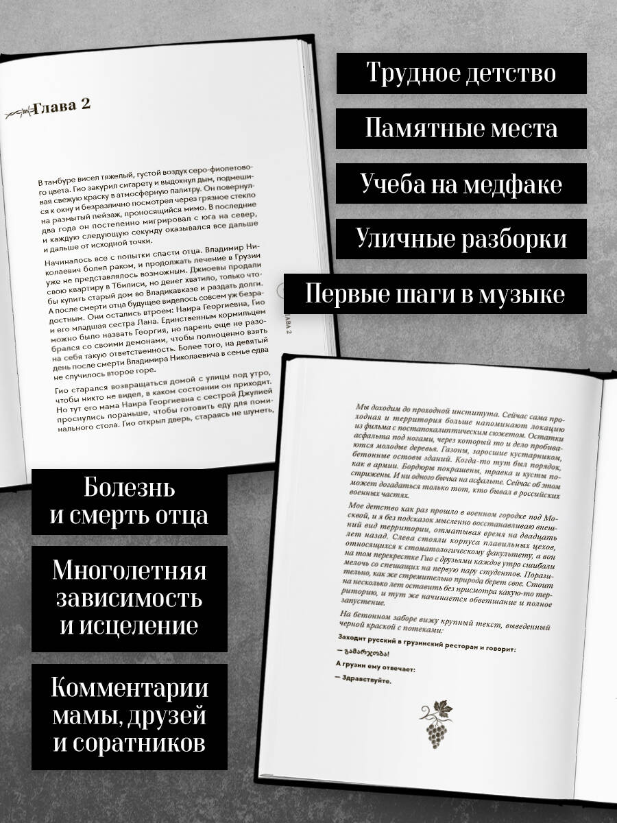 Писатель Владимир Еркович провел большое количество времени с самим Гио и его близкими людьми и восстановил весь путь становления Георгия: от тяжелого детства в небольшом городе до формирования одного из самых ярких артистов эпохи. Лаконичное оформление книги делает ее отличным артефактом для домашней библиотеки каждого, кто уважает творчество артиста.