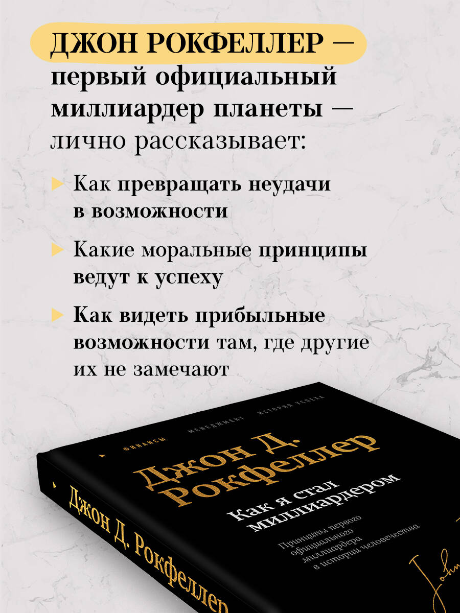 Ищите ответ в книге Джона Рокфеллера «Как я стал миллиардером», в которой он рассказал о своем пути к богатству, правилах успеха, моральных принципах бизнесмена и качествах, которые должен воспитывать в себе каждый предприниматель. Это не просто уникальные мемуары самого известного богача вселенной, но и практическое руководство к действию. С помощью них вы измените мышление, увидите прибыльные возможности, научитесь достигать поставленных целей и узнаете, как превратить любую неудачу в новую возможность.