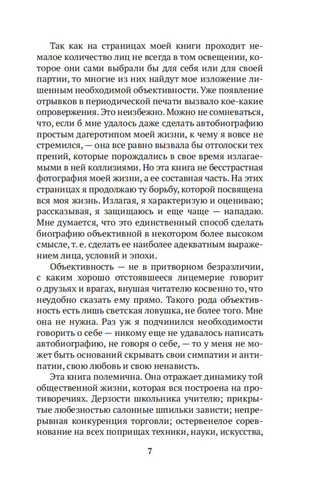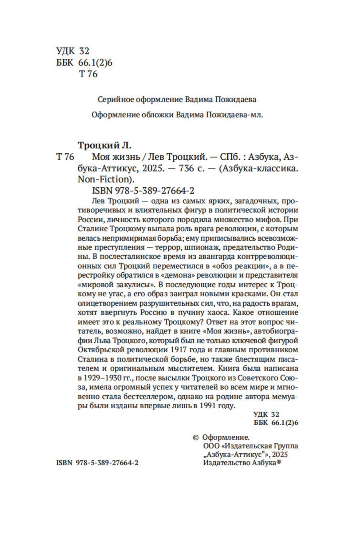 Лев Троцкий — одна из самых ярких, загадочных, противоречивых и влиятельных фигур в политической истории России, личность которого породила множество мифов. При Сталине Троцкому выпала роль врага революции, с которым велась непримиримая борьба; ему приписывались всевозможные преступления — террор, шпионаж, предательство Родины. В послесталинское время из авангарда контрреволюционных сил Троцкий переместился в «обоз реакции», а в перестройку обратился в «демона» революции и представителя «мировой закулисы». В последующие годы интерес к Троцкому не угас, а его образ заиграл новыми красками. Он стал олицетворением разрушительных сил, что, на радость врагам, хотят ввергнуть Россию в пучину хаоса. Какое отношение имеет это к реальному Троцкому? Ответ на этот вопрос читатель, возможно, найдет в книге «Моя жизнь», автобиографии Льва Троцкого, который был не только ключевой фигурой Октябрьской революции 1917 года и главным противником Сталина в политической борьбе, но также блестящим писателем и оригинальным мыслителем. Книга была написана в 1929–1930 гг., после высылки Троцкого из Советского Союза, имела огромный успех у читателей во всем мире и мгновенно стала бестселлером, однако на родине автора мемуары были изданы впервые лишь в 1991 году.