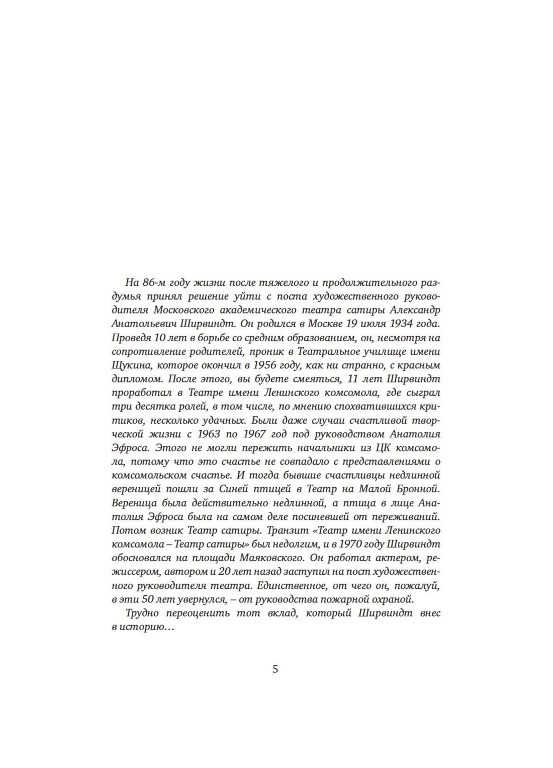 В 2019 году Александр Ширвиндт — всенародно любимый актер, режиссер и телеведущий — отметил юбилей. «Когда мне стукнуло 85, я подумал, что это вполне серьезная цифра, чтобы себя сформулировать», — так он пишет в предисловии к мемуарам «Опережая некролог».