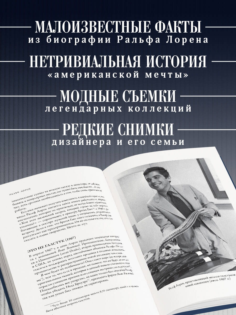 Автор книги, французский журналист Жером Каган, прослеживает более полувека пути Лорена: от скромного продавца галстуков до создателя модной империи. Издание сопровождают редкие фотографии самого дизайнера, его семьи и легендарных коллекций, ставших частью американской мечты.