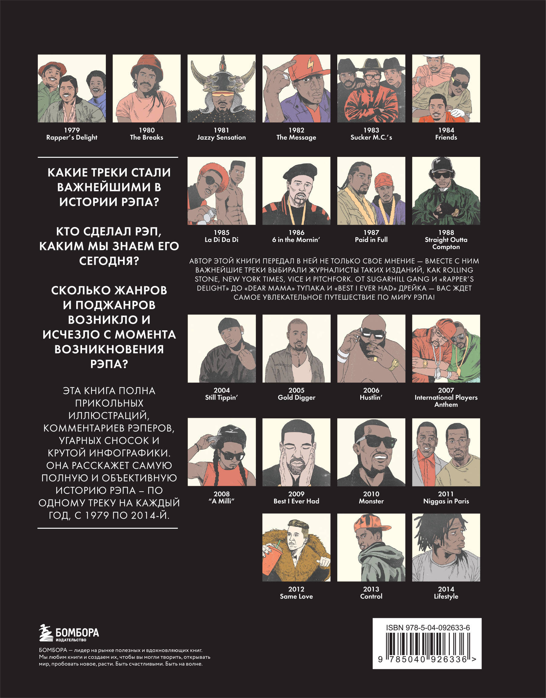 Книга от автора бестселлеров «Энциклопедия рэпа» и «Кино и кое-что еще». Шиа Серрано объединил все лучшее, что было в его предыдущих книгах. Формула проста: берем рэп, неожиданные вопросы о главных хип-хоп звездах в истории, добавляем иллюстрации художника Артуро Торреса, смешиваем с серьезной аналитикой и приправляем авторским юмором. Вуаля! Одна из лучших книг о культуре хип-хопа готова.