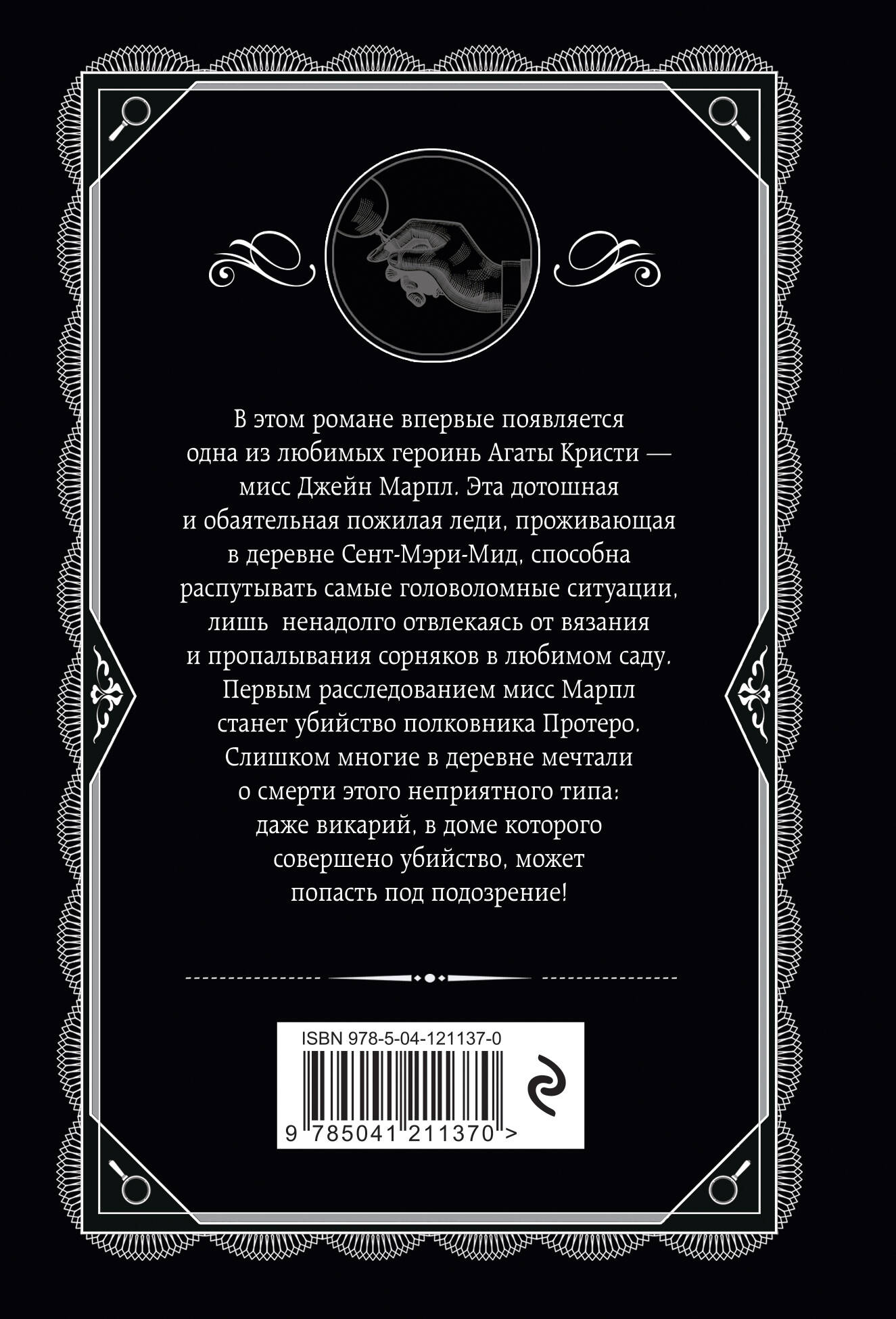 В этом романе впервые появляется одна из любимых героинь Агаты Кристи – мисс Джейн Марпл. Эта дотошная и обаятельная пожилая леди, проживающая в деревне Сент-Мэри-Мид, способна распутывать самые головоломные ситуации, лишь ненадолго отвлекаясь от вязания и пропалывания сорняков в любимом саду. Первым расследованием мисс Марпл станет убийство полковника Протеро. Слишком многие в деревне мечтали о смерти этого неприятного типа: даже викарий, в доме которого совершено убийство, может попасть под подозрение!