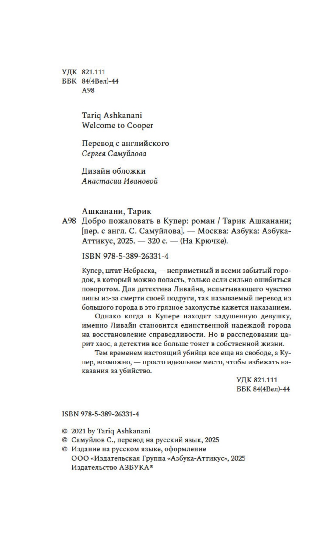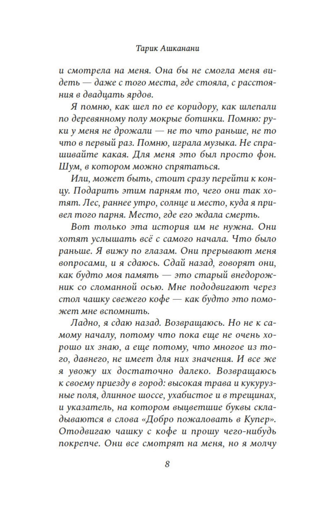За свой дебютный роман «Добро пожаловать в Купер» Тарик Ашканани получил премию Bloody Scotland Debut Award. Кроме того, эта книга вошла в шорт-лист CWA New Blood Dagger. Секрет успеха прост: автор мастерски закручивает сюжет, приправляя его яркими твистами и кровавыми подробностями. Перелистывая страницу за страницей, читатель остается в неведении, кто на самом деле совершает ужасные преступления, но в конце романа его ожидает взрывной финал, который никак нельзя предугадать.