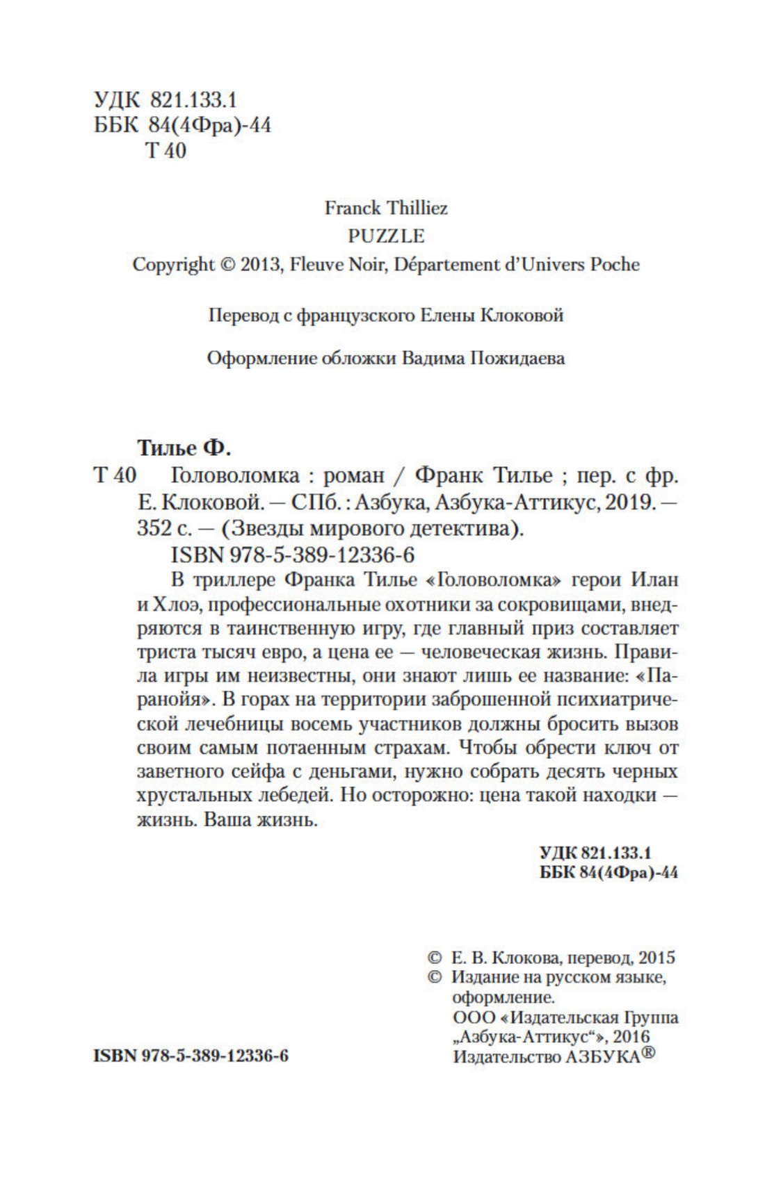 В триллере Франка Тилье «Головоломка» герои Илан и Хлоэ, профессиональные охотники за сокровищами, внедряются в таинственную игру, где главный приз составляет триста тысяч евро, а цена ее — человеческая жизнь. Правила игры им неизвестны, они знают лишь ее название: «Паранойя». В горах на территории заброшенной психиатрической лечебницы восемь участников должны бросить вызов своим самым потаенным страхам. Чтобы обрести ключ от заветного сейфа с деньгами, нужно собрать десять черных хрустальных лебедей. Но осторожно: цена такой находки — жизнь. Ваша жизнь.