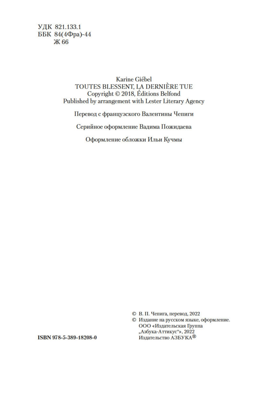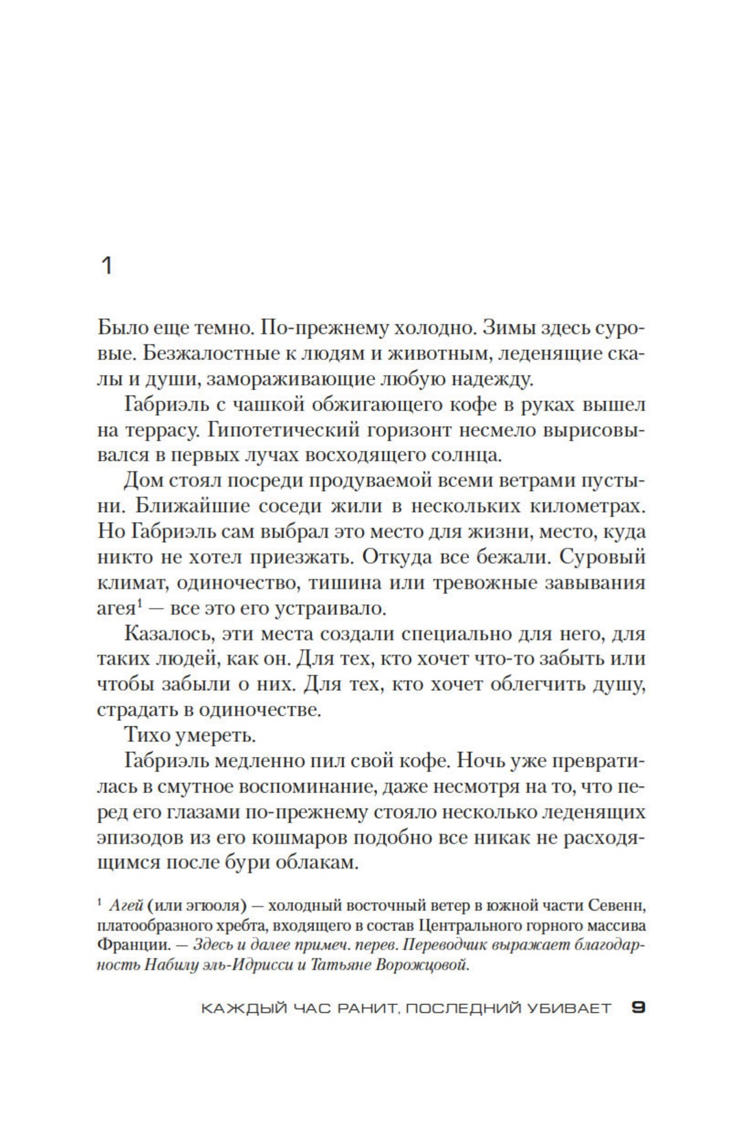 Книги королевы триллера Карин Жибель переведены на десяток языков и удостоены многочисленных литературных наград, в том числе Prix Polar за лучший роман на французском языке. За роман «Каждый час ранит, последний убивает» она получила «Золотое перо французского триллера» и Prix de l’Evêché. Этот роман Жибель написала по мотивам реальных историй женщин, лишившихся свободы и столкнувшихся с крайними формами насилия, — и получился триллер о человеческой жестокости, искуплении и личной свободе, которая стоит очень дорого и порой оплачивается только кровью.