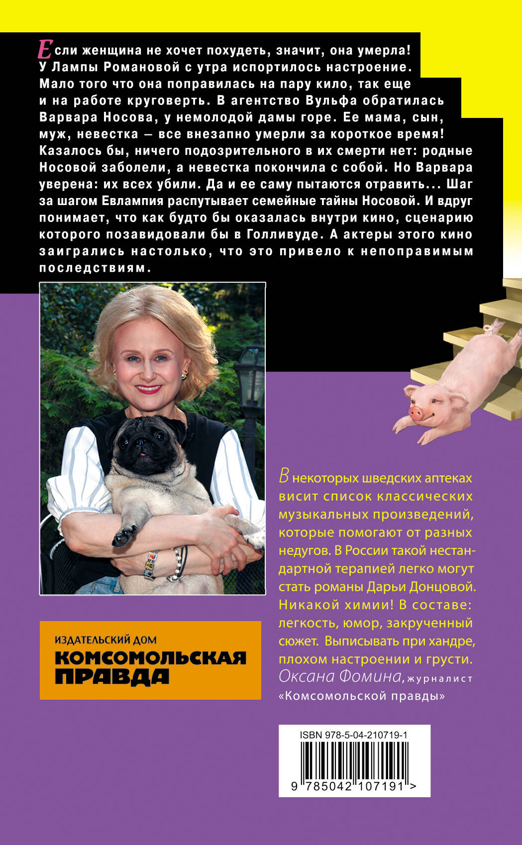 Если женщина не хочет похудеть, значит, она умерла! У Лампы Романовой с утра испортилось настроение. Мало того, что она поправилась на пару кило, так еще и на работе круговерть. В агентство Вульфа обратилась Варвара Носова, у немолодой дамы горе. Ее мама, сын, муж, невестка, все внезапно умерли за короткое время! Казалось бы, ничего подозрительного в их смерти нет: родные Носовой заболели, а невестка покончила с собой. Но Варвара уверена: их всех убили. Да и ее саму пытаются отравить... Шаг за шагом Евлампия распутывает семейные тайны Носовой. И вдруг понимает, что как будто бы оказалась внутри кино, сценарию которого позавидовали бы в Голливуде. А актеры этого кино заигрались настолько, что это привело к непоправимым последствиям.