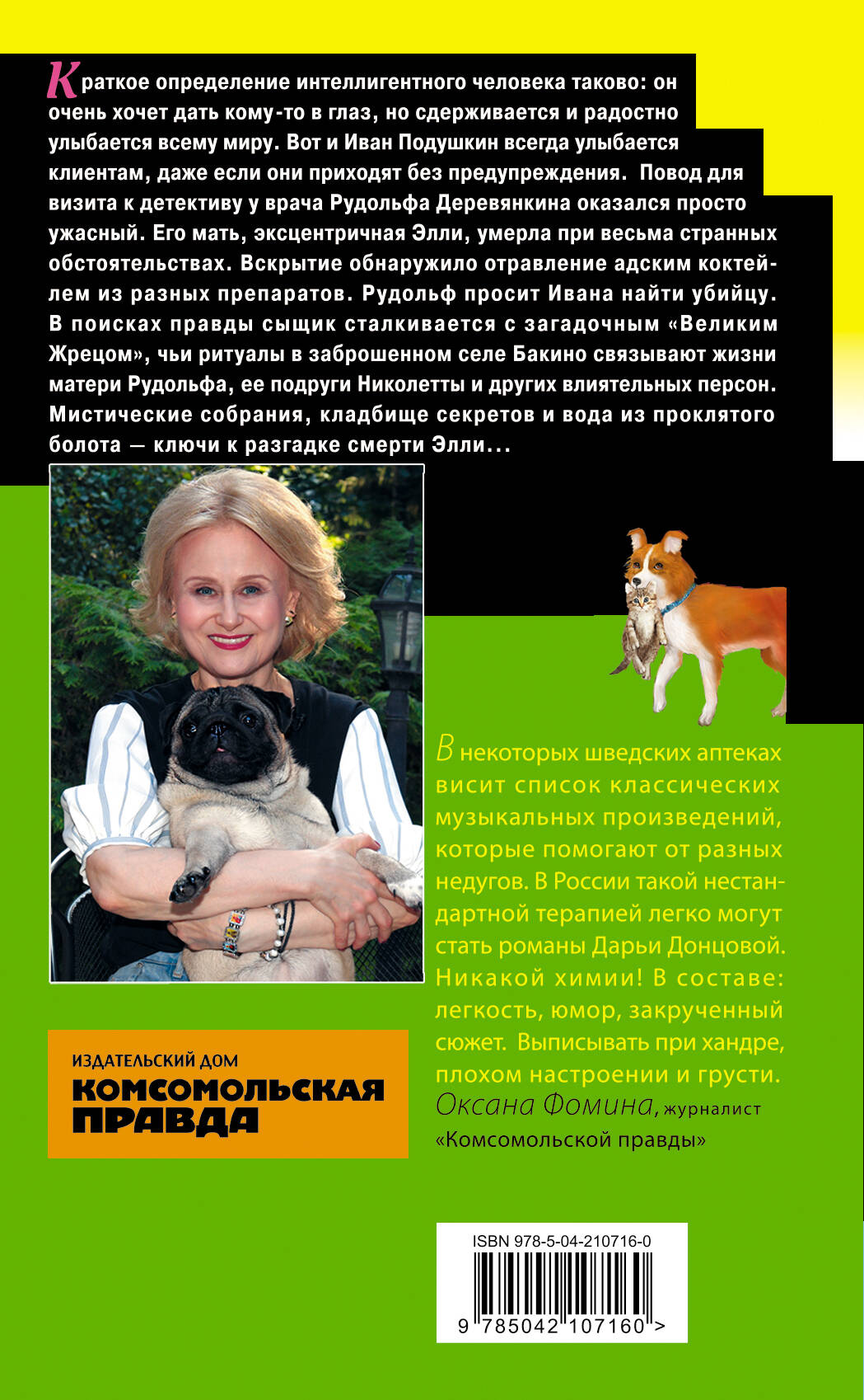 Краткое определение интеллигентного человека таково: он очень хочет дать кому-то в глаз, но сдерживается и радостно улыбается всему миру. Вот и Иван Подушкин всегда радуется клиентам, даже если они приходят без предупреждения. Повод для визита к детективу у врача Деревянкина Рудольфа оказался просто ужасным. Его мать, эксцентричная Элли, умерла при весьма странных обстоятельствах. Вскрытие обнаружило отравление адским коктейлем из разных препаратов. Рудольф просит Ивана найти убийцу. В поисках правды сыщик сталкивается с загадочным «Великим Жрецом». Его ритуалы в заброшенном селе Бакино связывают жизни матери Рудольфа, ее подруги Николетты и других влиятельных персон. Мистические собрания, кладбище секретов и вода из проклятого болота — ключи к разгадке смерти Элли...