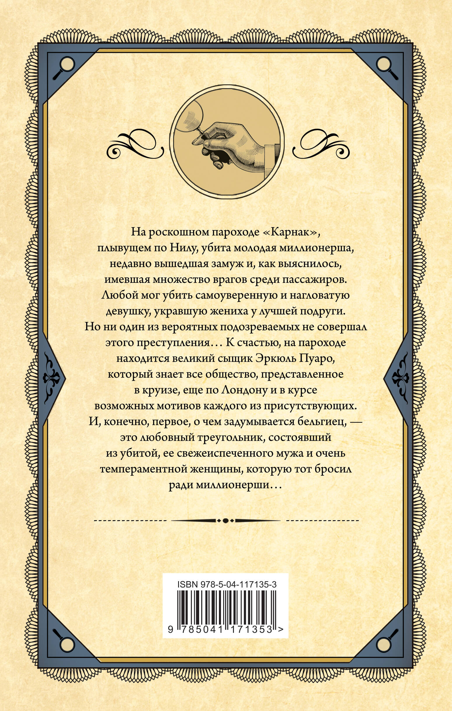 На роскошном пароходе «Карнак», плывущем по Нилу, убита молодая миллионерша, недавно вышедшая замуж и, как выяснилось, имевшая множество врагов среди пассажиров. Любой мог убить самоуверенную и нагловатую девушку, укравшую жениха у лучшей подруги. Но ни один из вероятных подозреваемых не совершал этого преступления… К счастью, на пароходе находится великий сыщик Эркюль Пуаро, который знает все общество, представленное в круизе, еще по Лондону, и в курсе возможных мотивов каждого из присутствующих. И, конечно, первое, о чем задумывается бельгиец, – это о «любовном треугольнике», состоявшем из убитой, ее свежеиспеченного мужа и очень темпераментной женщины, которую тот бросил ради миллионерши…
