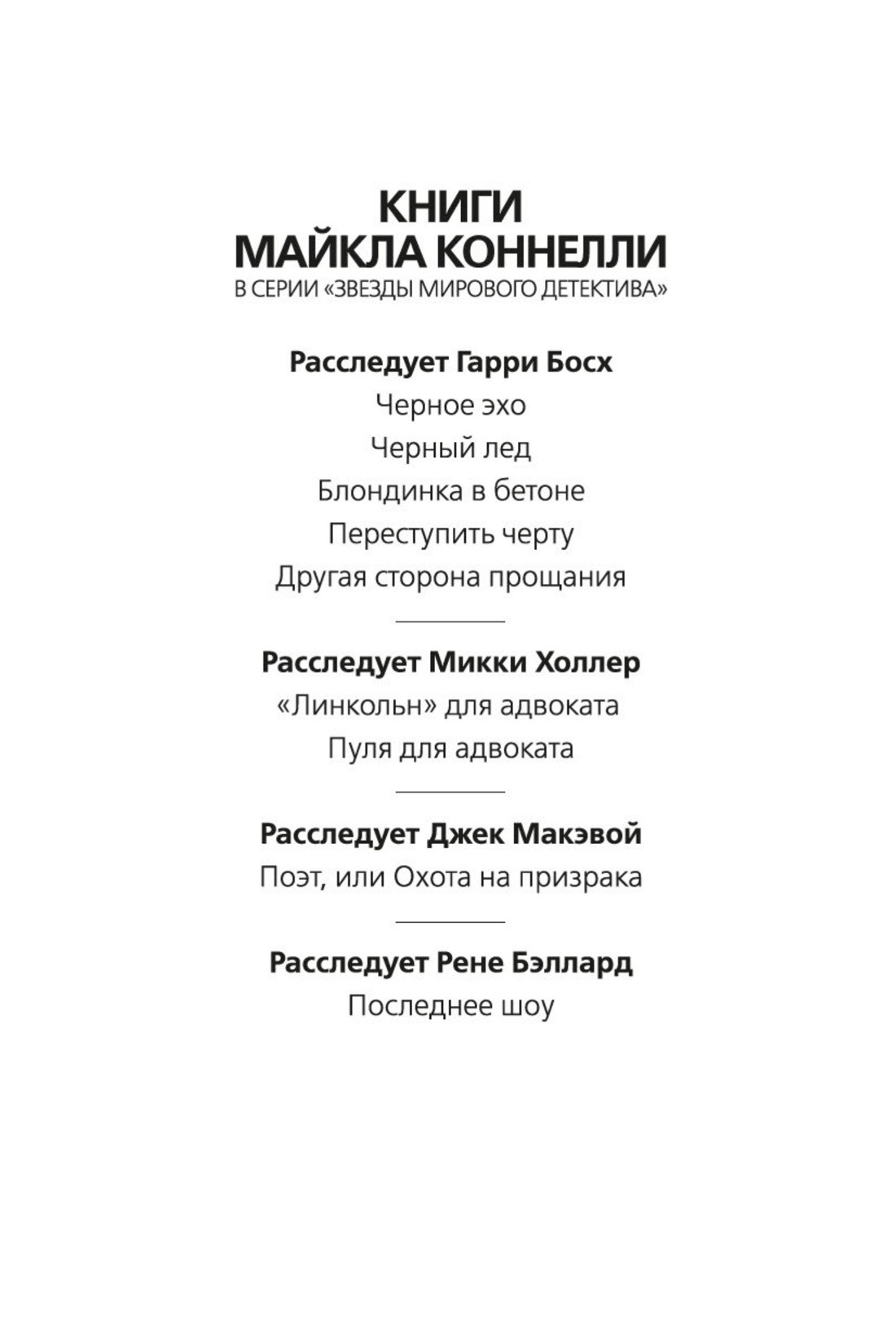 Наконец-то дела у адвоката защиты Микки Холлера идут на лад! После двух лет фатального невезения он возвращается в зал суда, чтобы защищать киномагната, обвиняемого в убийстве своей жены и ее любовника. Нет худа без добра, как бы цинично это ни звучало, — Холлер получил крупное, обещающее громкий успех дело «в наследство» от убитого коллеги, голливудского адвоката Джерри Винсента. Обстоятельства его гибели расследует опытный детектив Гарри Босх, при первой же встрече предупреждающий об опасности: Холлера тоже заставят замолчать навсегда и это лишь вопрос времени. И поскольку события разворачиваются стремительно, эти двое одиночек понимают, что выход у них один: работать вместе…