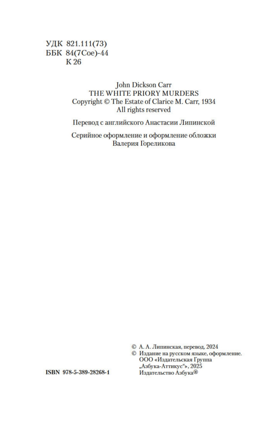 Золотой век детектива оставил немало звездных имен — А. Кристи, Г. К. Честертон, Г. Митчелл и др. В этой яркой плеяде Джон Диксон Карр (1906–1977) занимает самое почетное место. «Убийство в запертой комнате», где нет места бешеным погоням и перестрелкам, а круг подозреваемых максимально ограничен, — излюбленный прием автора. Карр вовлекает читателя в сети ловко расставленных ловушек, обманных ходов и тонких намеков и предлагает принять участие в решении хитроумной головоломки, распутывая ниточки «невозможных» преступлений. В романе «Убийства в Белом Монастыре» (1934) читатель вновь встретится с обаятельным и эксцентричным сэром Генри Мерривейлом, который был признан одним из самых неординарных сыщиков в детективной литературе. Молодой дипломат по имени Джеймс Беннет, американский племянник сэра Генри, приезжает в Лондон и получает приглашение провести Рождество в Суррее, в поместье Белый Монастырь. В числе гостей — голливудская кинозвезда, с которой Беннет познакомился еще в Америке, а также ее многочисленная свита. Беннета терзают тяжелые предчувствия, и он обращается за советом к Мерривейлу…