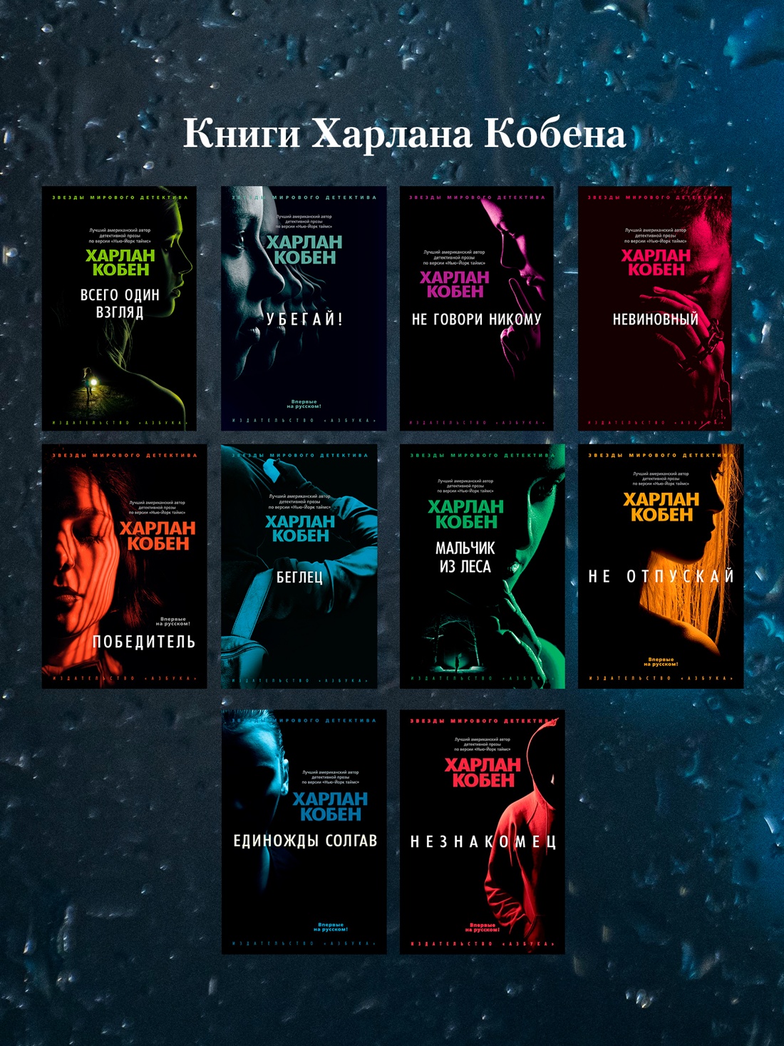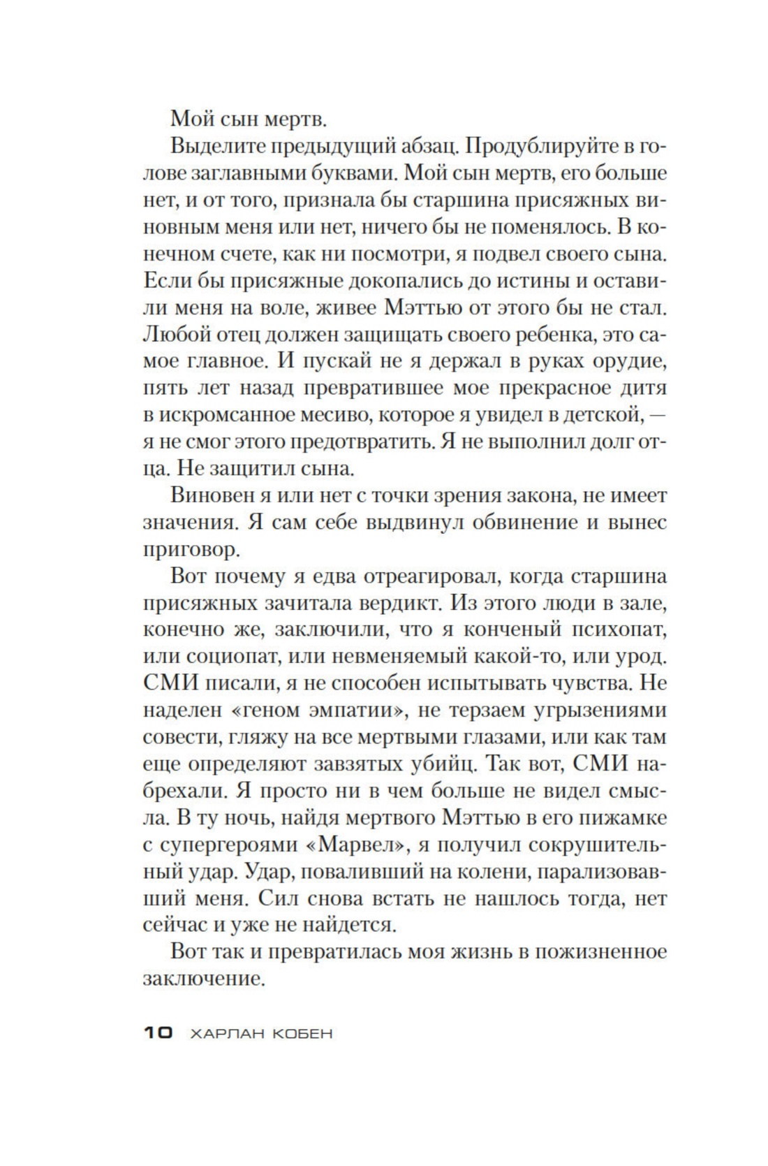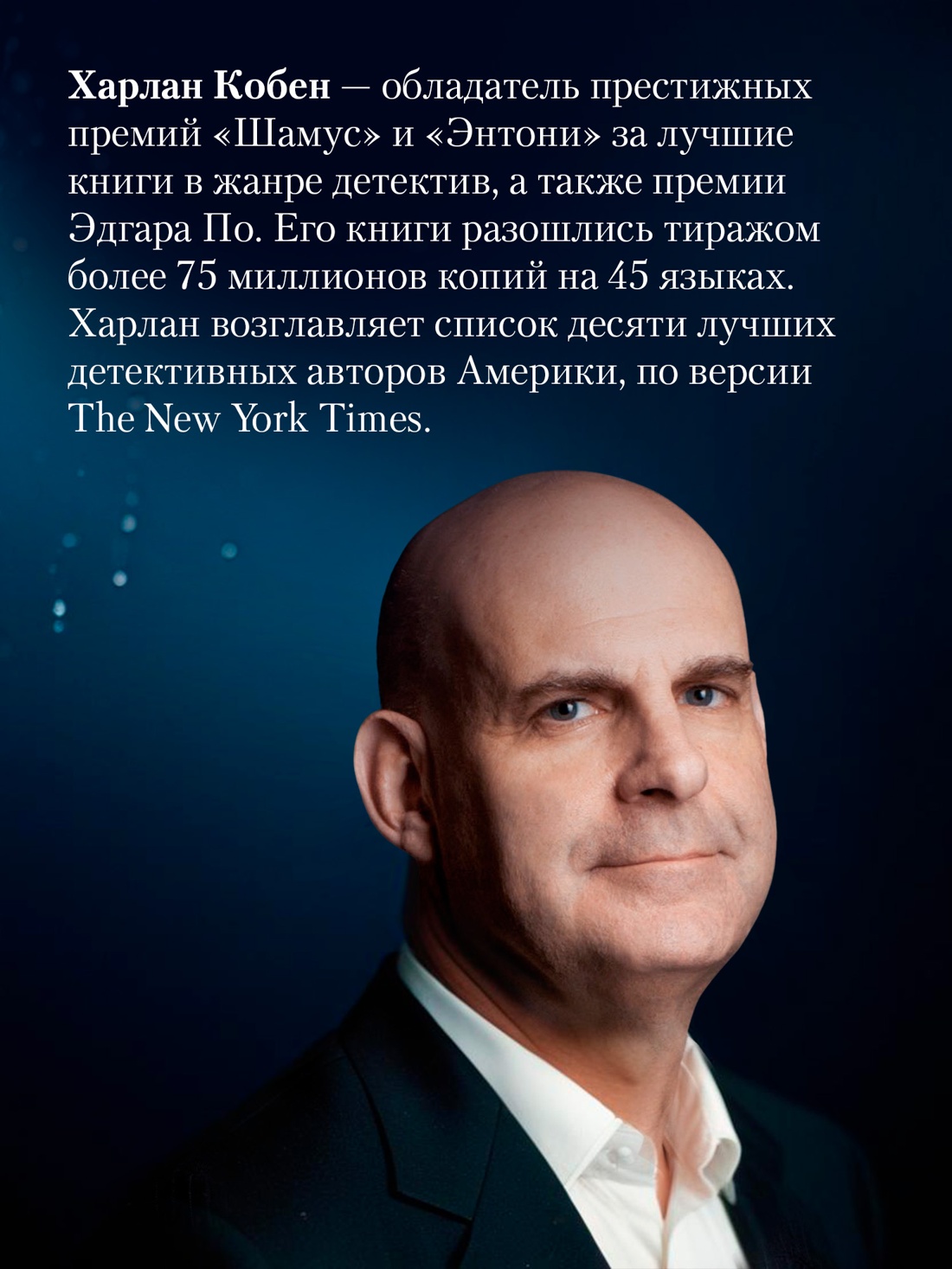 Харлан Кобен — первый в списке десяти лучших детективных писателей Америки по версии «New York Times», лауреат премий «Шамус», «Энтони», «Эдгар», «Серебряная пуля». Его романы литературные критики называют гениальными, острыми и проницательными, неизменно увлекательными, превосходными и обязательными для чтения. «Я не напрасно причисляю Кобена к великим писателям — возьмите любой из его романов, и вы погрузитесь в историю столь же запутанную, сколь захватывающую и при этом живую». Так отозвалась о нем Гиллиан Флинн, автор международного бестселлера «Исчезнувшая».
