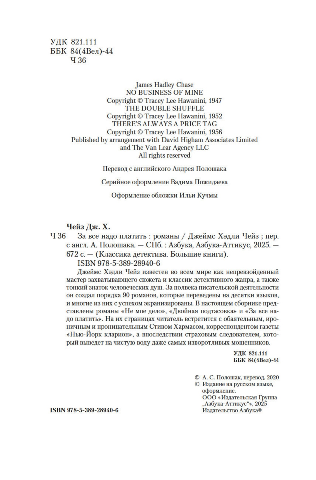 Джеймс Хэдли Чейз известен во всем мире как непревзойденный мастер захватывающего сюжета и классик детективного жанра, а также тонкий знаток человеческих душ. За полвека писательской деятельности он создал порядка 90 романов, которые переведены на десятки языков, и многие из них с успехом экранизированы. В настоящем сборнике представлены романы «Не мое дело», «Двойная подтасовка» и «За все надо платить». На их страницах читатель встретится с обаятельным, ироничным и проницательным Стивом Хармасом, корреспондентом газеты «Нью-Йорк кларион», а впоследствии страховым следователем, который выведет на чистую воду даже самых изворотливых мошенников.