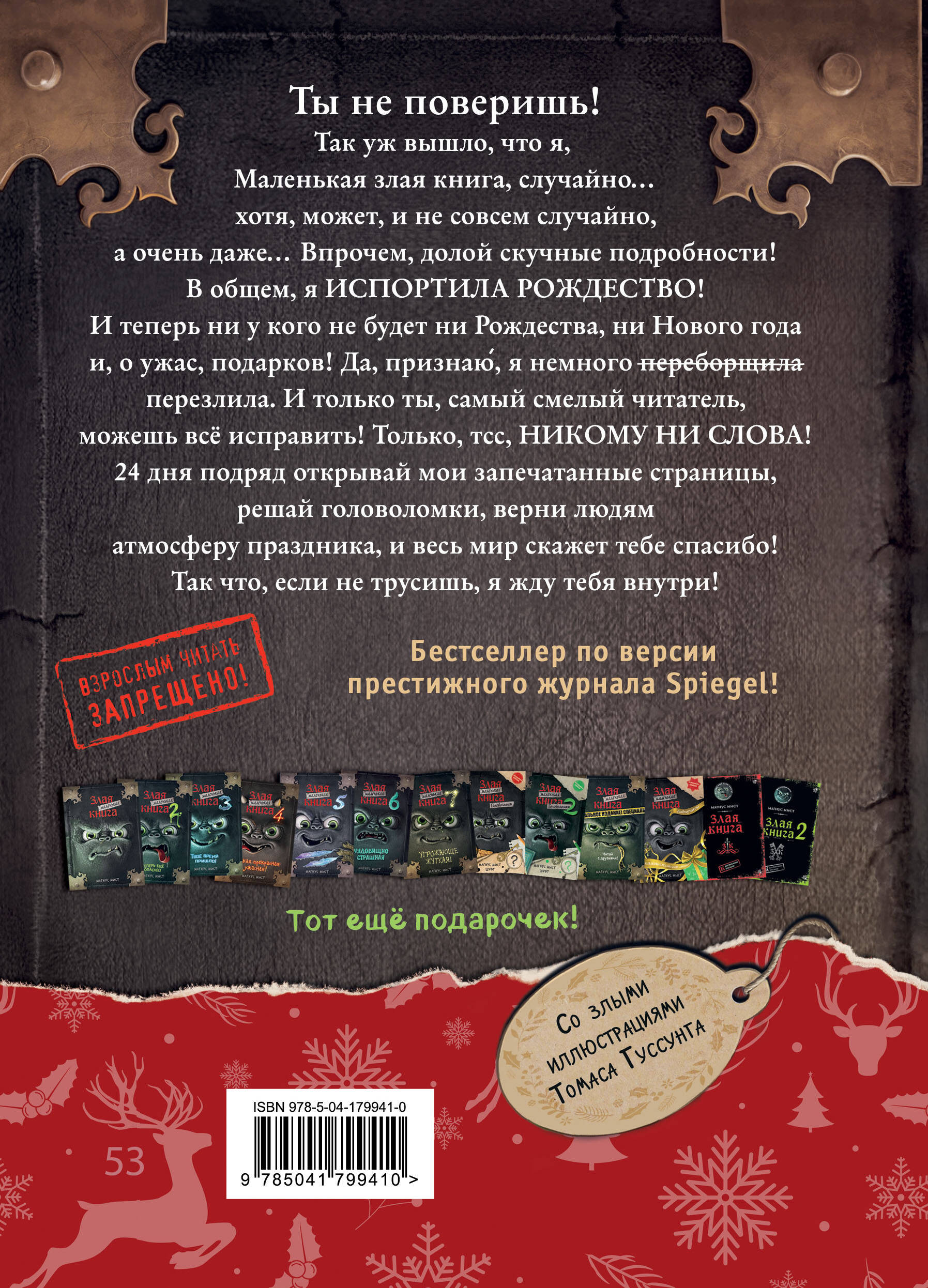«Маленькая злая книга» снова удивляет! Фишка этого издания — запечатанные страницы, которые нужно открывать строго по 2 в день (и так 24 раза!). Но что осталось неизменным — так это весёлые приключения, неожиданные повороты сюжета, разнообразные задания и встречи с удивительными героями.