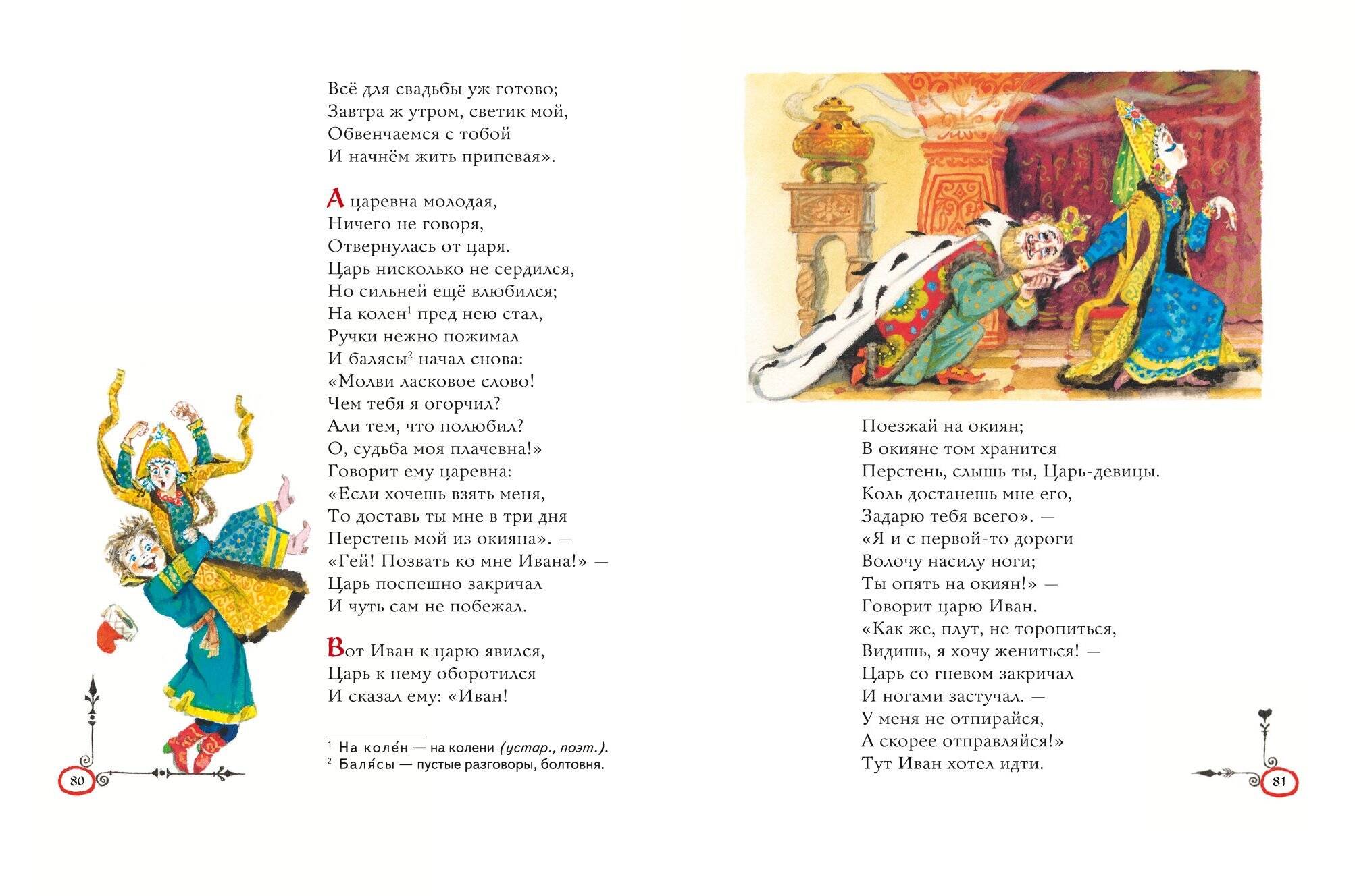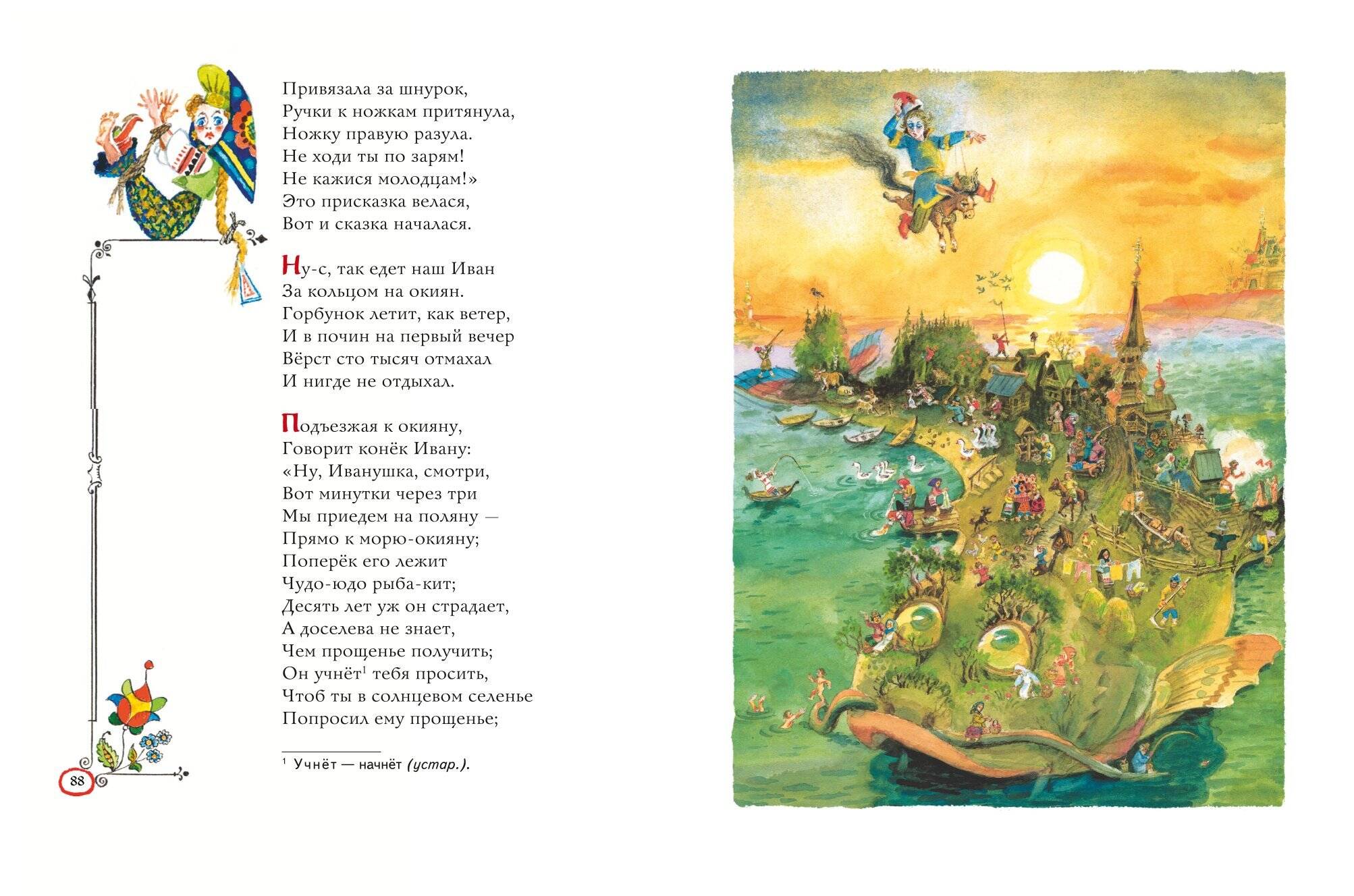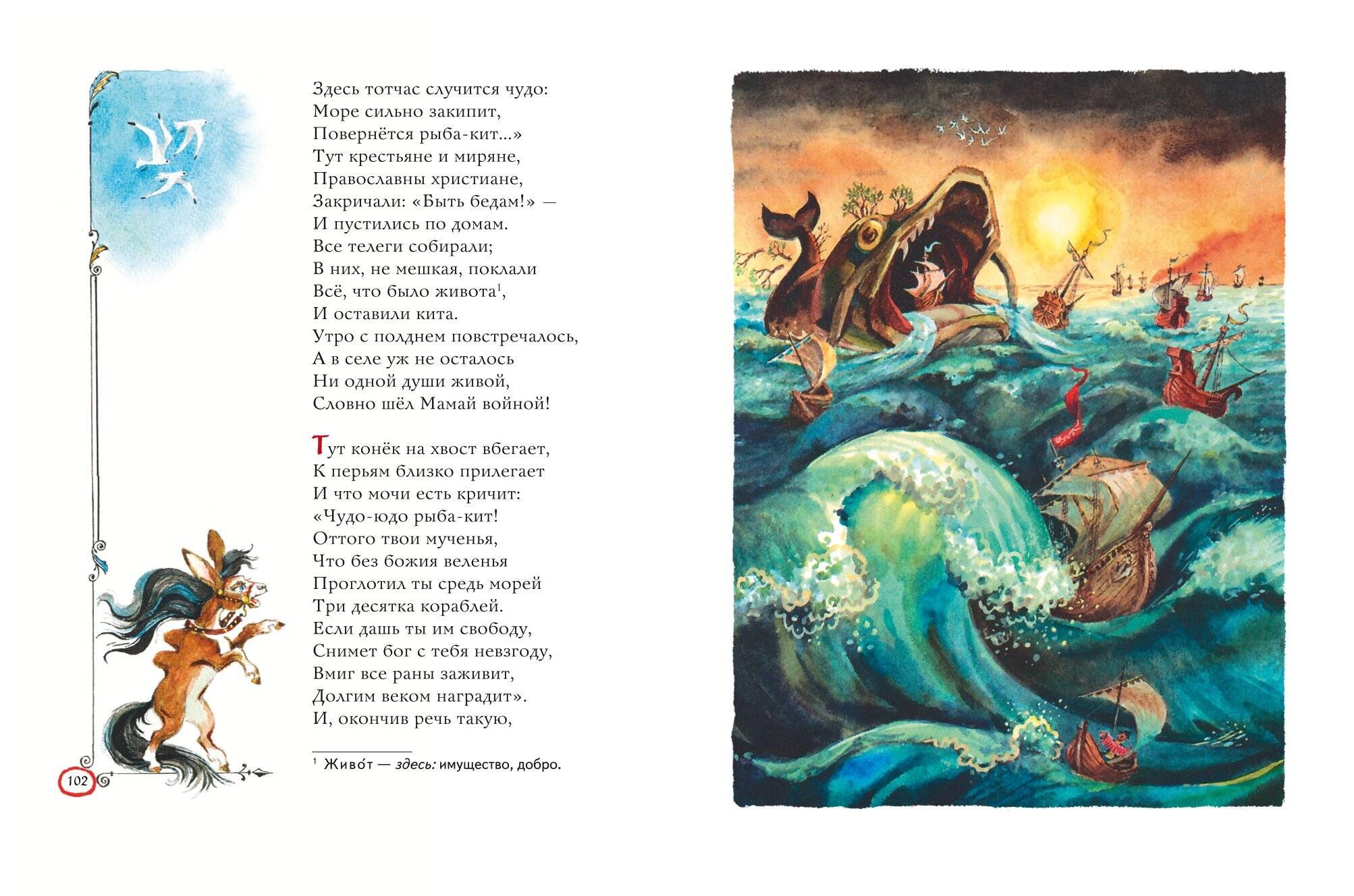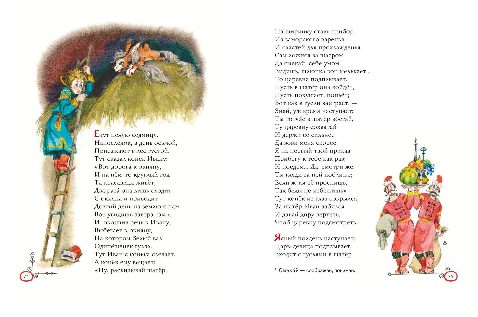 Замечательная поэтическая сказка Петра Павловича Ершова «Конёк-горбунок» приглашает читателей совершить увлекательное путешествие по волшебным царствам и мирам и пережить множество необыкновенных приключений. Звонкие, легко запоминающиеся строчки расскажут о традиционном герое русского фольклора — простодушном Иванушке и о его верном друге, чудесном коньке-горбунке. А тонкие, изящные и точные иллюстрации известного мастера, народного художника России Анатолия Елисеева помогут познакомиться поближе с диковинными существами и подробно рассмотреть все детали необыкновенных странствий.