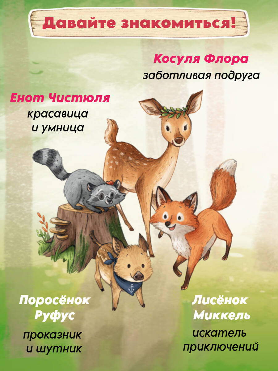 Перед вами Четвёрка отважных: поросёнок Руфус, лисёнок Миккель, енот Чистюля и косуля Флора. Зверята всегда готовы прийти на помощь, найти потерянное настроение и подсказать выход даже из самой трудной ситуации!