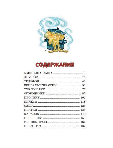 В книгу «Мишкина каша. Рассказы» вошли 14 самых известных, весёлых и добрых историй с яркими и забавными иллюстрациями Владимира Канивца: «Мишкина каша», «Огородники», «Клякса», «И я помогаю» и другие.