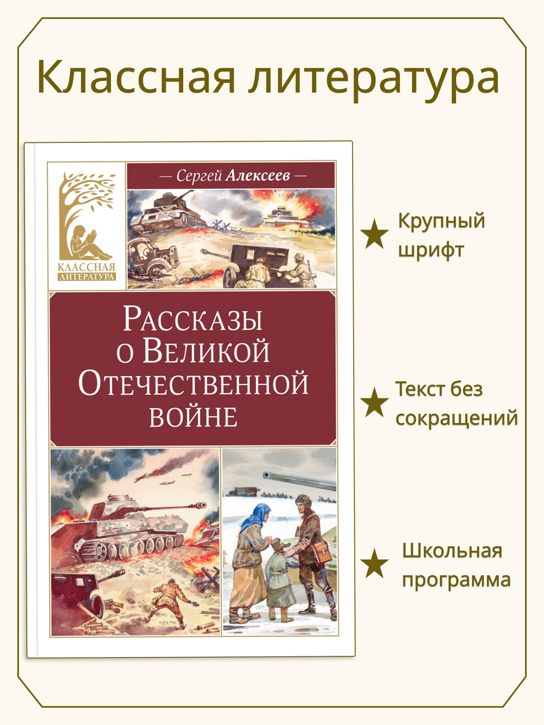 В рассказах известного писателя Сергея Алексеева повествуется о героях и ключевых событиях Великой Отечественной войны. Битва под Москвой и битва на Курской дуге, героическая оборона Сталинграда и Севастополя, блокада Ленинграда и штурм Берлина – всё это живо и достоверно описано простым и понятным для детей языком. Алексеев сам прошёл войну и рассказал в своих произведениях о том, каким трудным был путь к Победе…