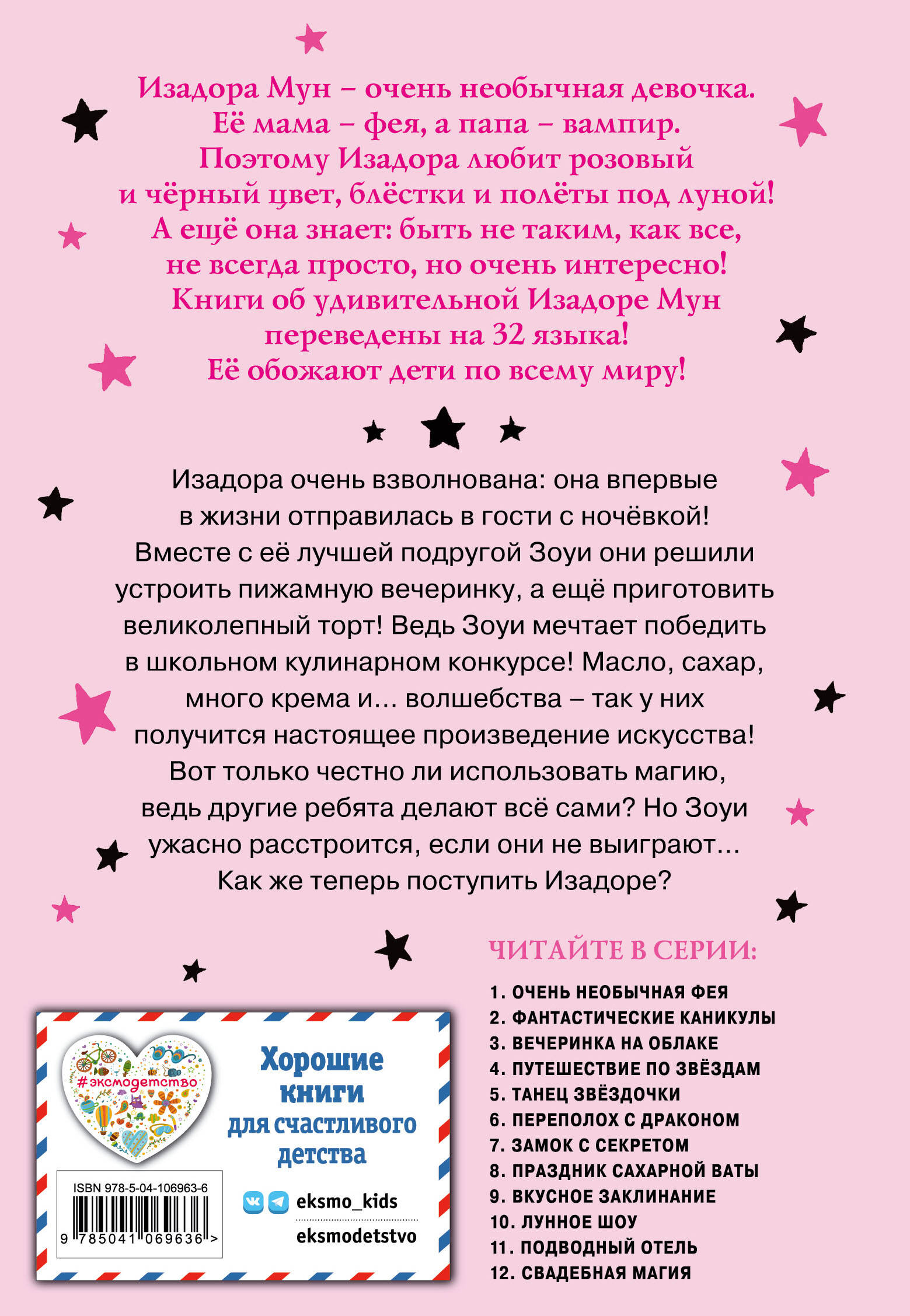 Отправиться в гости с ночёвкой — Изадора так мечтала об этом! И вот её подруга Зоуи пригласила её на пижамную вечеринку! Вместе они будут не только веселиться и играть, но и печь вкусный-превкусный торт! А всё потому, что девочки очень хотят выиграть в школьном кулинарном конкурсе. Масло, сахар, крем и… магия — вот рецепт самого грандиозного торта в мире! Но честно ли использовать волшебство, если другие ребята всё делают сами? Изадора в этом совсем не уверена. С другой стороны, Зоуи ужасно расстроится, если они не выиграют… Как же теперь быть?