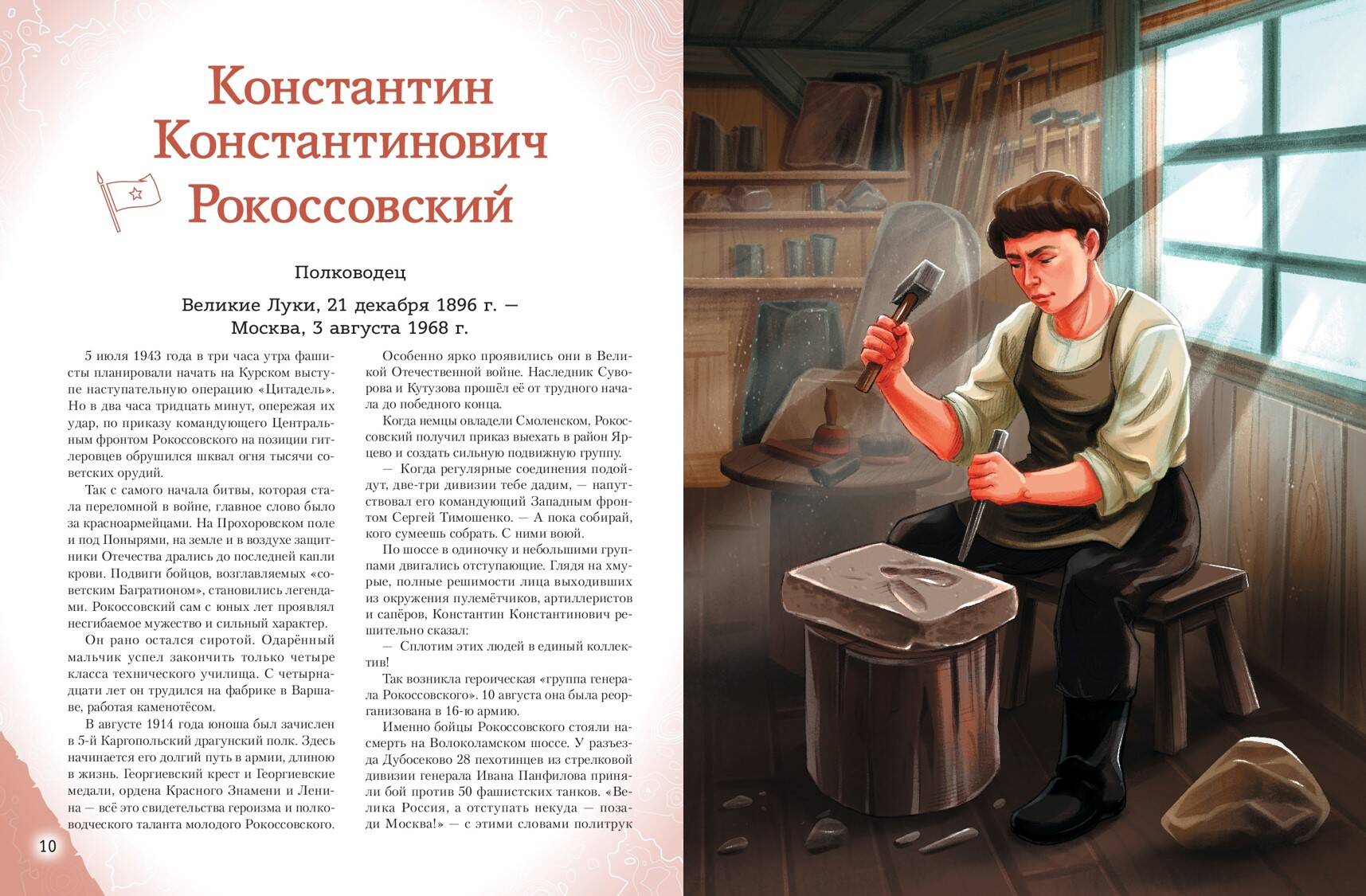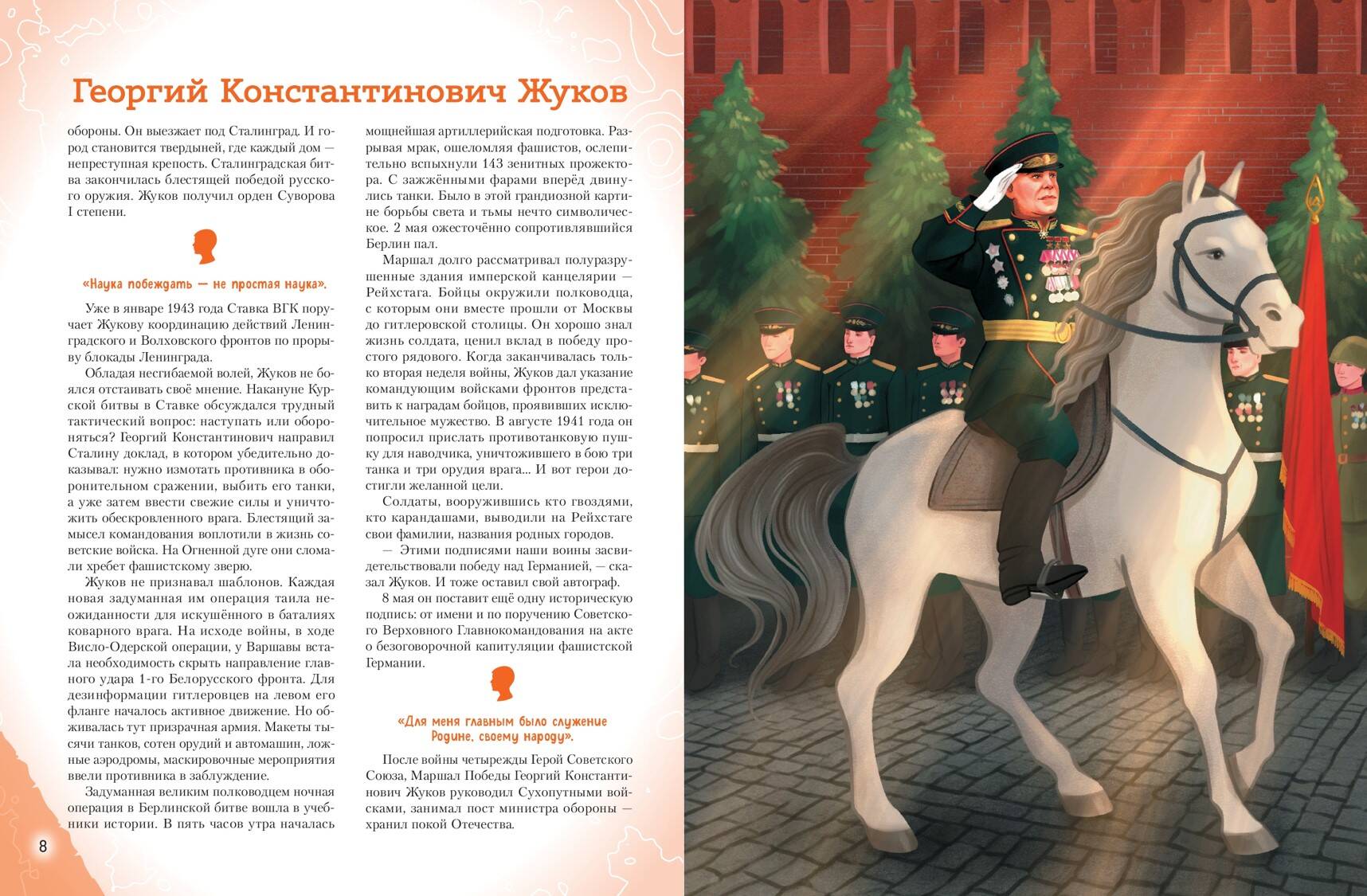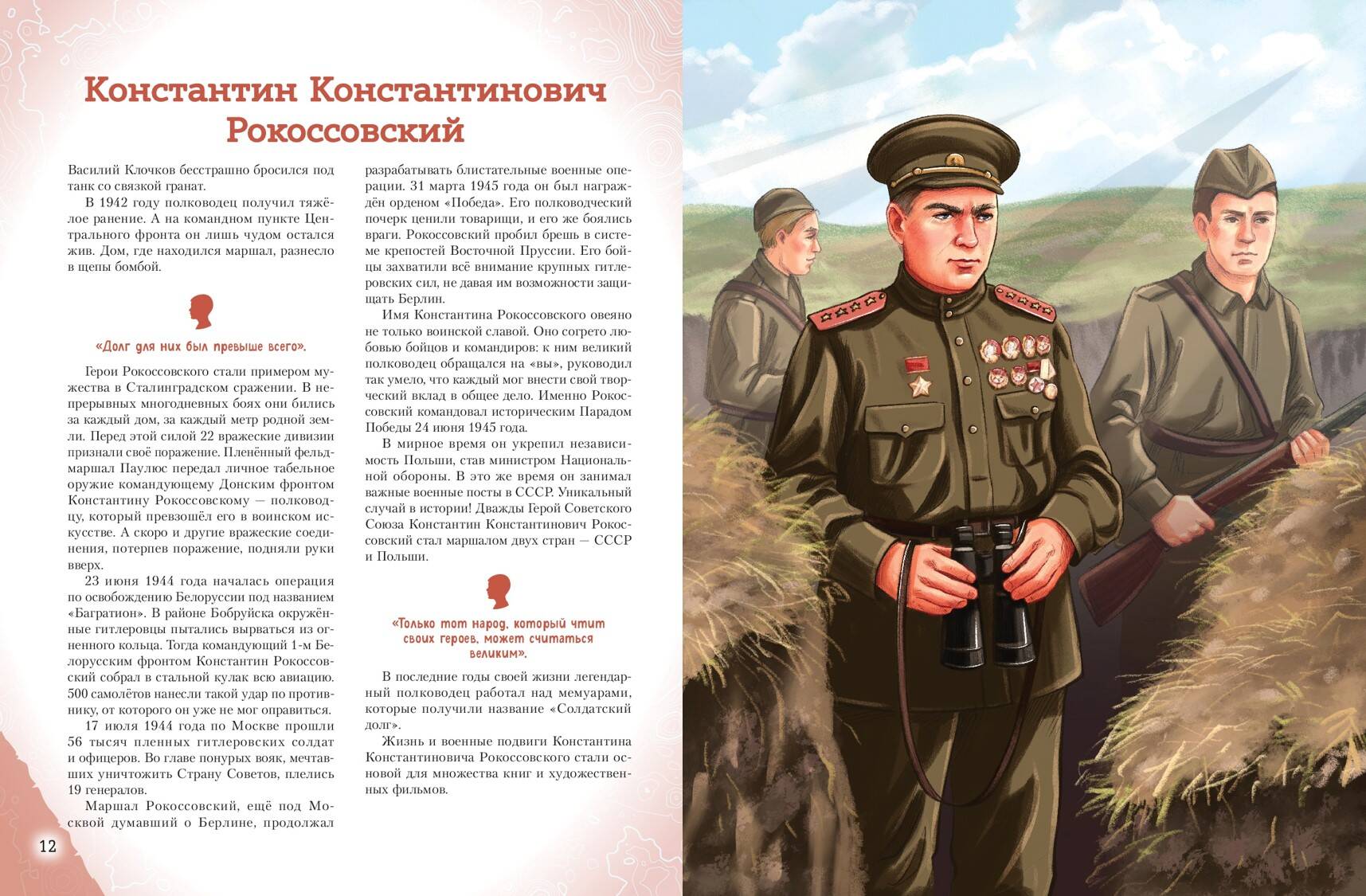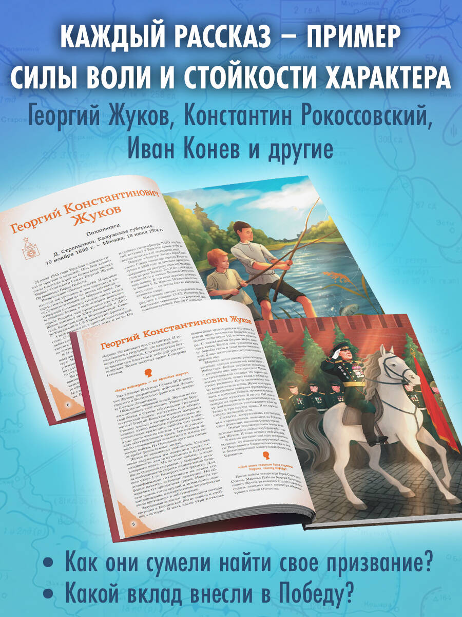 В сборник включены рассказы о Маршале Победы — Георгии Жукове, маршалах Иване Коневе и Константине Рокоссовском, главкоме ВМФ Николае Кузнецове, лётчике-асе Иване Кожедубе, создателе танка Т-34 Михаиле Кошкине, главном хирурге Красной Армии Николае Бурденко, а также о менее известных героях, от медсестры З. Туснолобовой, вынесшей с поля боя более 120 раненых, до Александра Матросова, закрывшего грудью вражеский дзот.