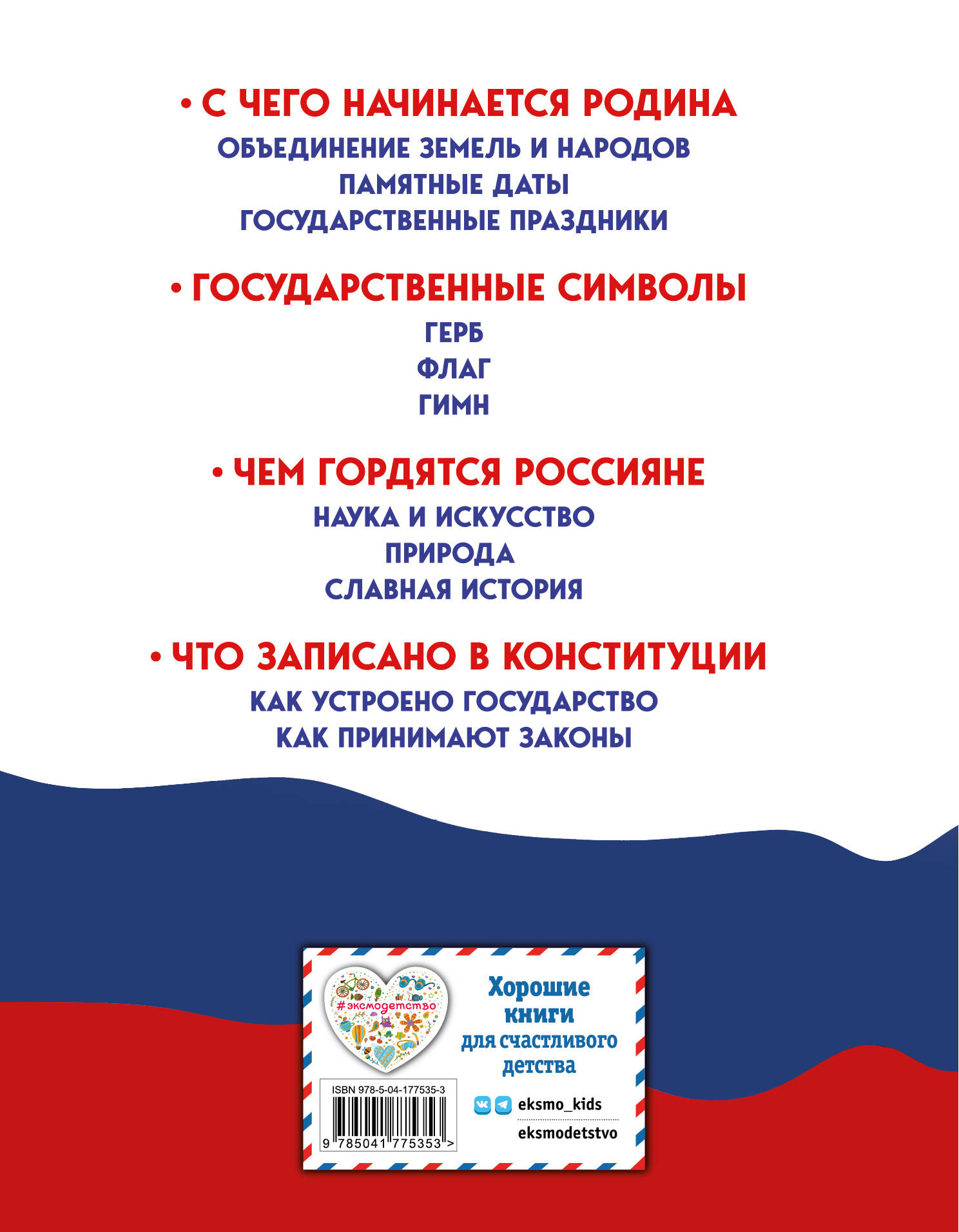 Что означает быть настоящим патриотом и что нужно знать и уметь маленькому гражданину, чтобы в будущем принести пользу нашей стране? В этой небольшой, но такой необходимой каждому юному россиянину книге собраны главнейшие темы для «Разговоров о важном» — внеурочных занятий, являющихся частью школьной образовательной программы: история, культурное и природное наследие, законы и устройство нашего государства.