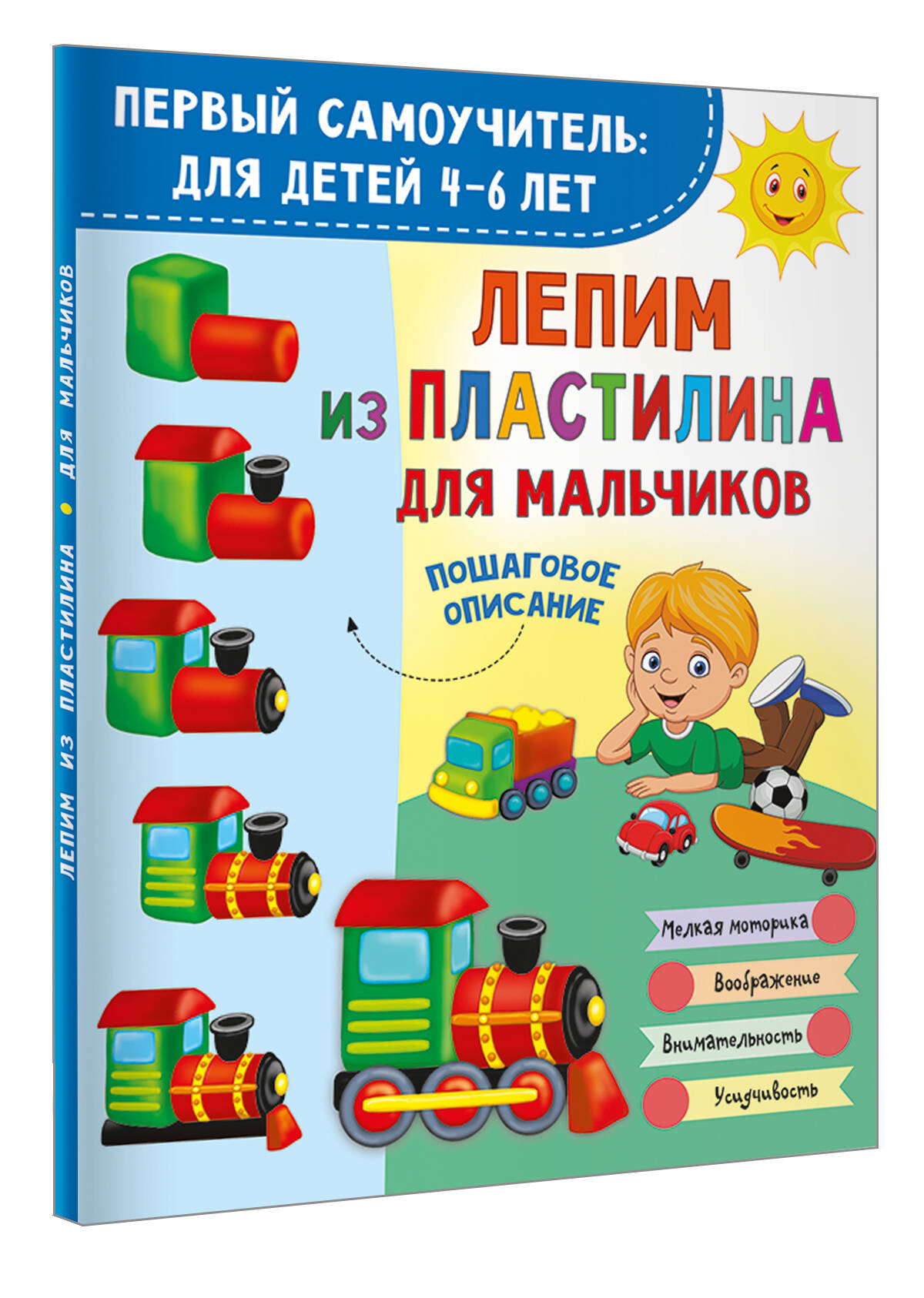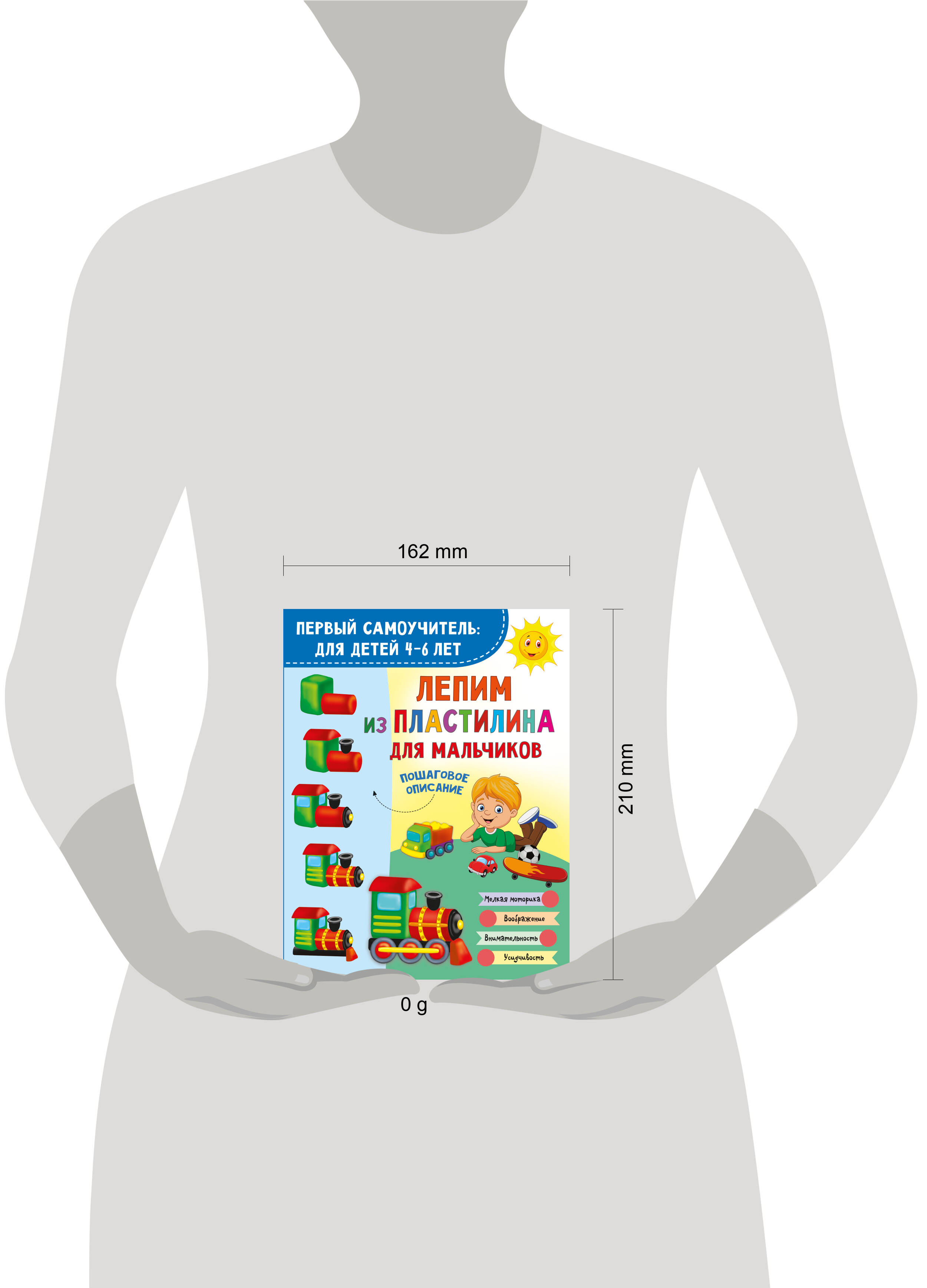 "Лепим из пластилина для мальчиков" — самоучитель, который поможет малышу своими руками сделать фигурки из пластилина. Детальные уроки, пошаговые схемы и крупные красочные образцы — ребёнок сможет справиться даже без помощи взрослых! Классная подборка поделок, которые будут интересны мальчикам: динозаврики, машинки, забавные персонажи и зверята. Занимаясь лепкой по нашей книге, ребёнок потренирует пальчики и подготовит руку к письму, разовьёт воображение и творческое мышление, внимательность и усидчивость.