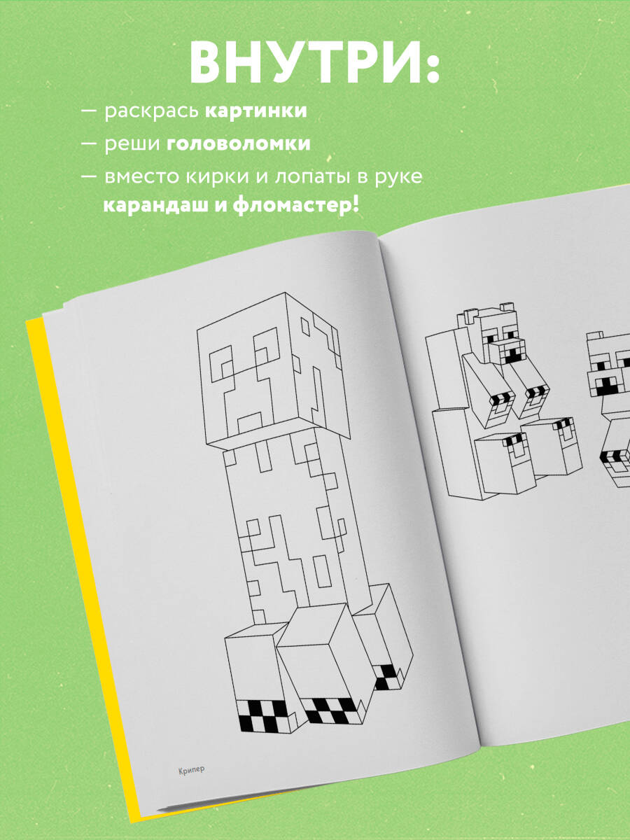Что, если мир Майнкрафт существует за пределами компьютерной игры? Множество пиксельных пейзажей развернулось на страницах этой раскраски, но вот беда — чего-то не хватает! Мир стал черно-белым, и только ты сможешь помочь местным жителям и мобам вернуть себе цвет. Совсем не обязательно иметь при себе кирку. Вооружившись карандашами и фломастерами, тебе предстоит исследовать мир игры на бумаге, попутно решая головоломки. Будет весело!