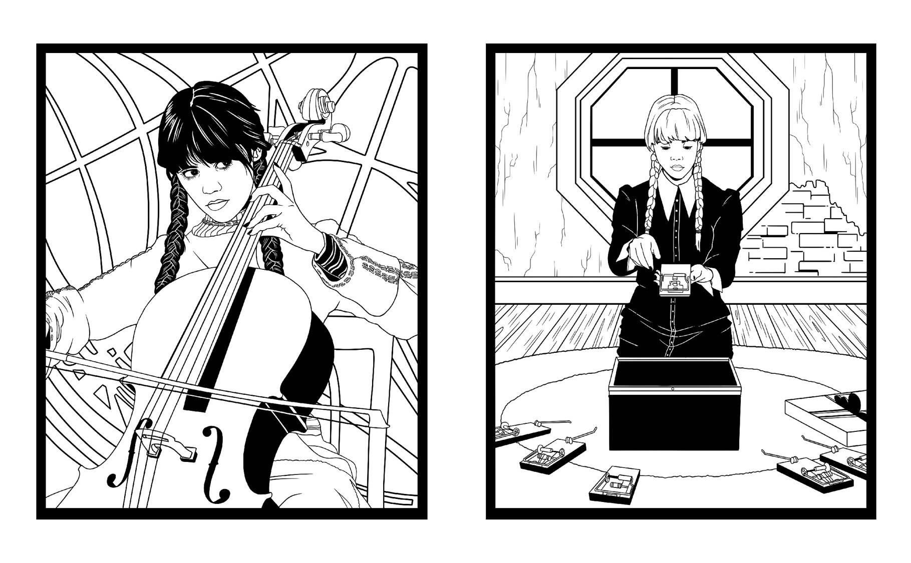 Раскраска станет отличным подарком на день рождения и любой другой праздник для всех любителей готики, сериала «Уэнсдей» и семейки Аддамс.