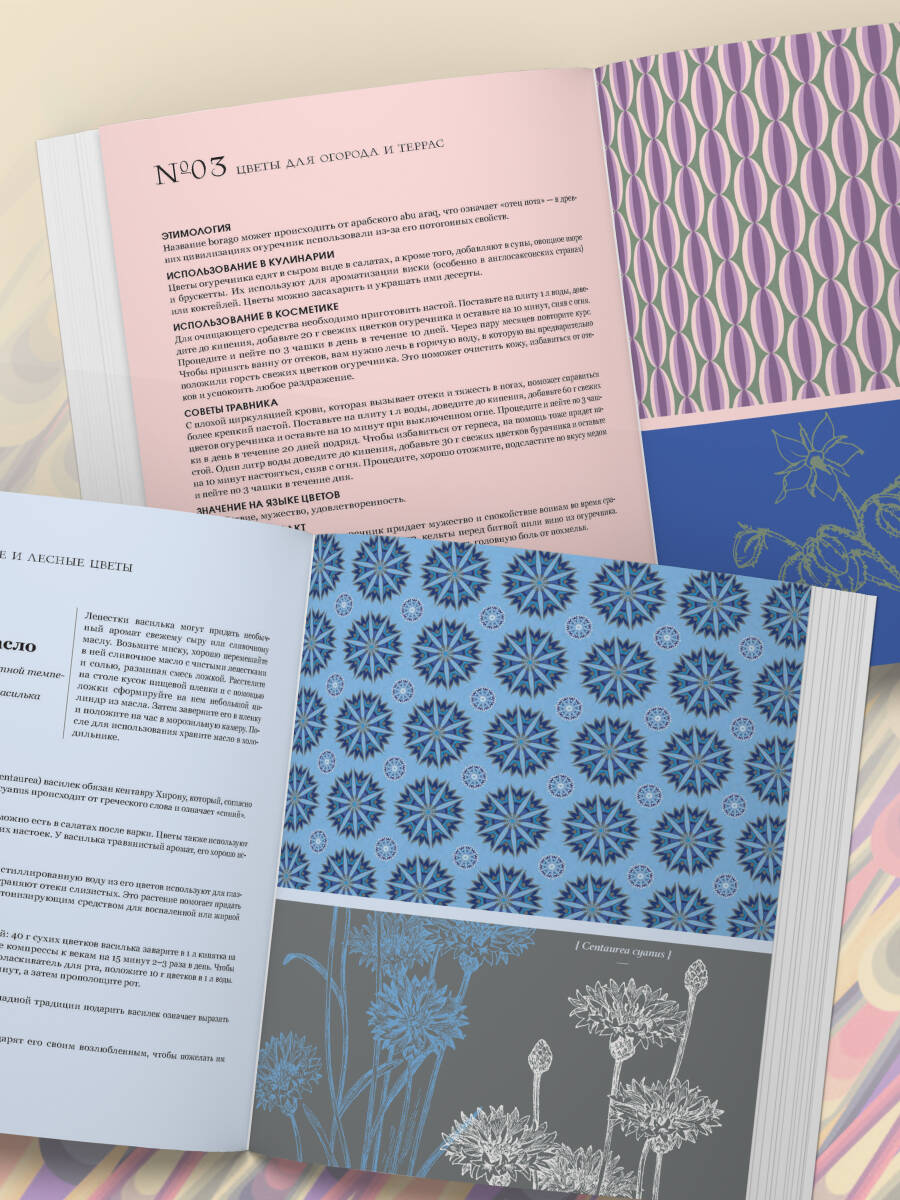 - Яркие авторские иллюстрации в орнаментальном стиле.