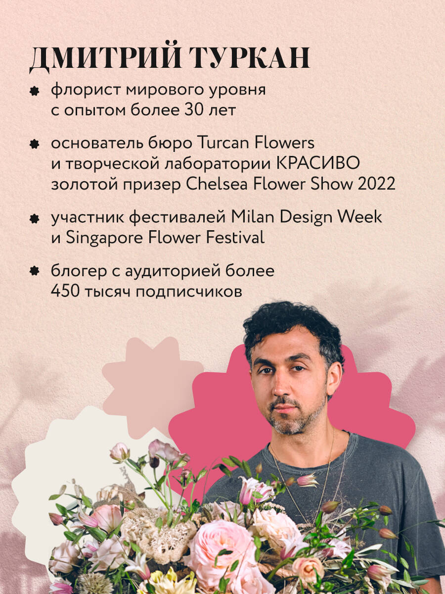 Автор Дмитрий Туркан — флорист мирового уровня с уникальным и узнаваемым стилем, медалист самых масштабных флористических событий мира, работающий с главами государств и международными мероприятиями. Дмитрий основал бюро «Turcan Flowers» в Санкт-Петербурге и школу «Turcan Flower School», лично обучил более 700 мастеров со всего света.