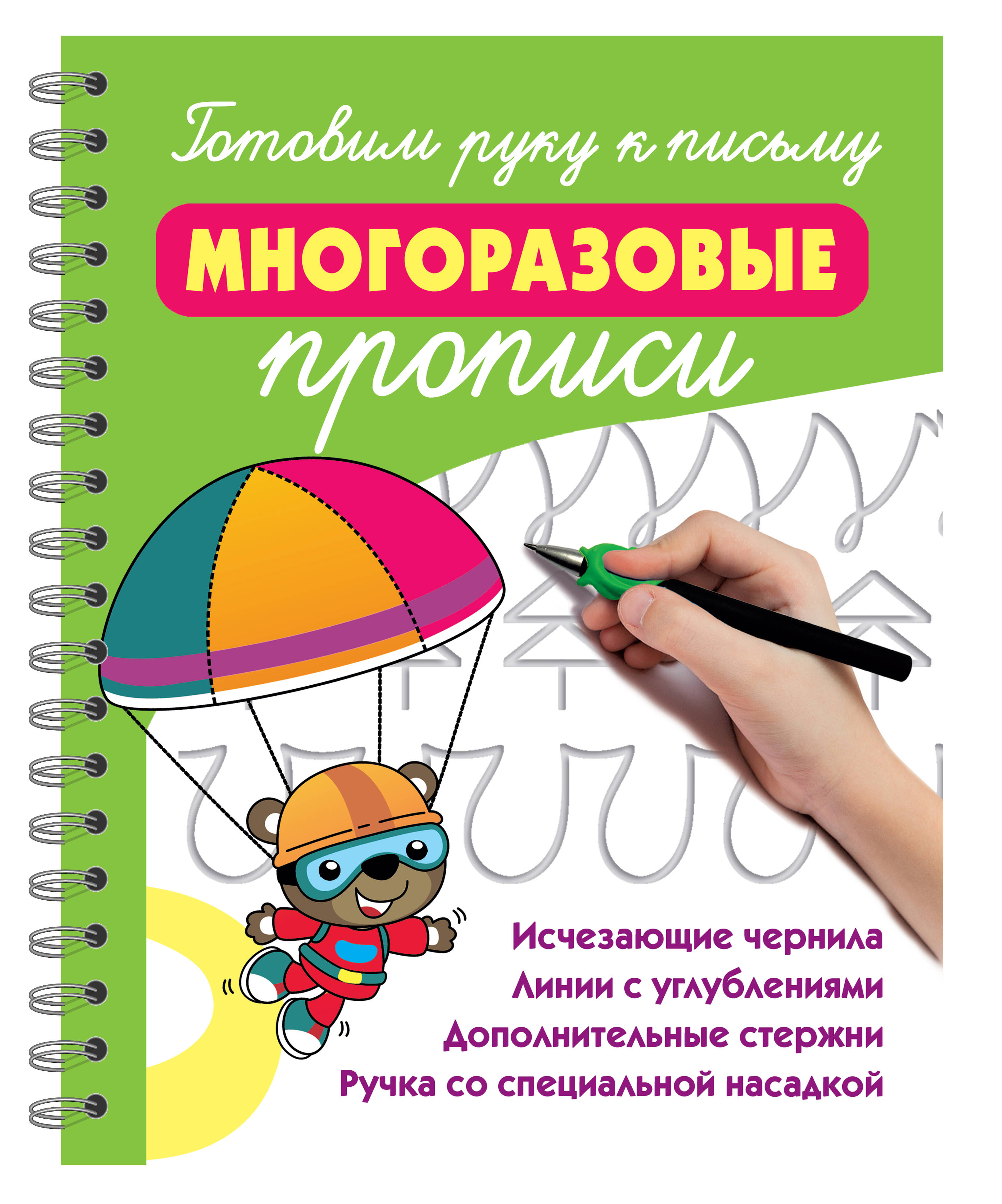 "Готовим руку к письму: многоразовые прописи" — это волшебная книга с трафаретными буквами, которые помогут будущим школьникам подготовить руку к письму. В наборе — ручка, 10 запасных стержней с ичезающими чернилами и насадка для правильного формирования почерка. Можно тренироваться хоть тысячу раз!