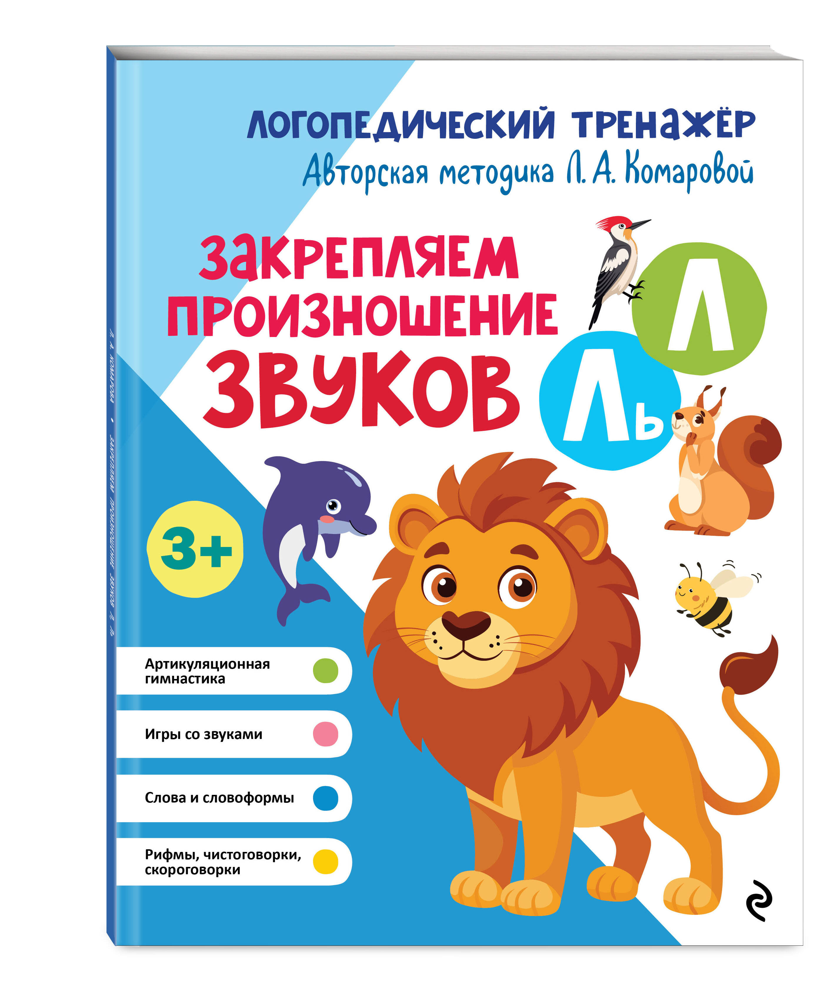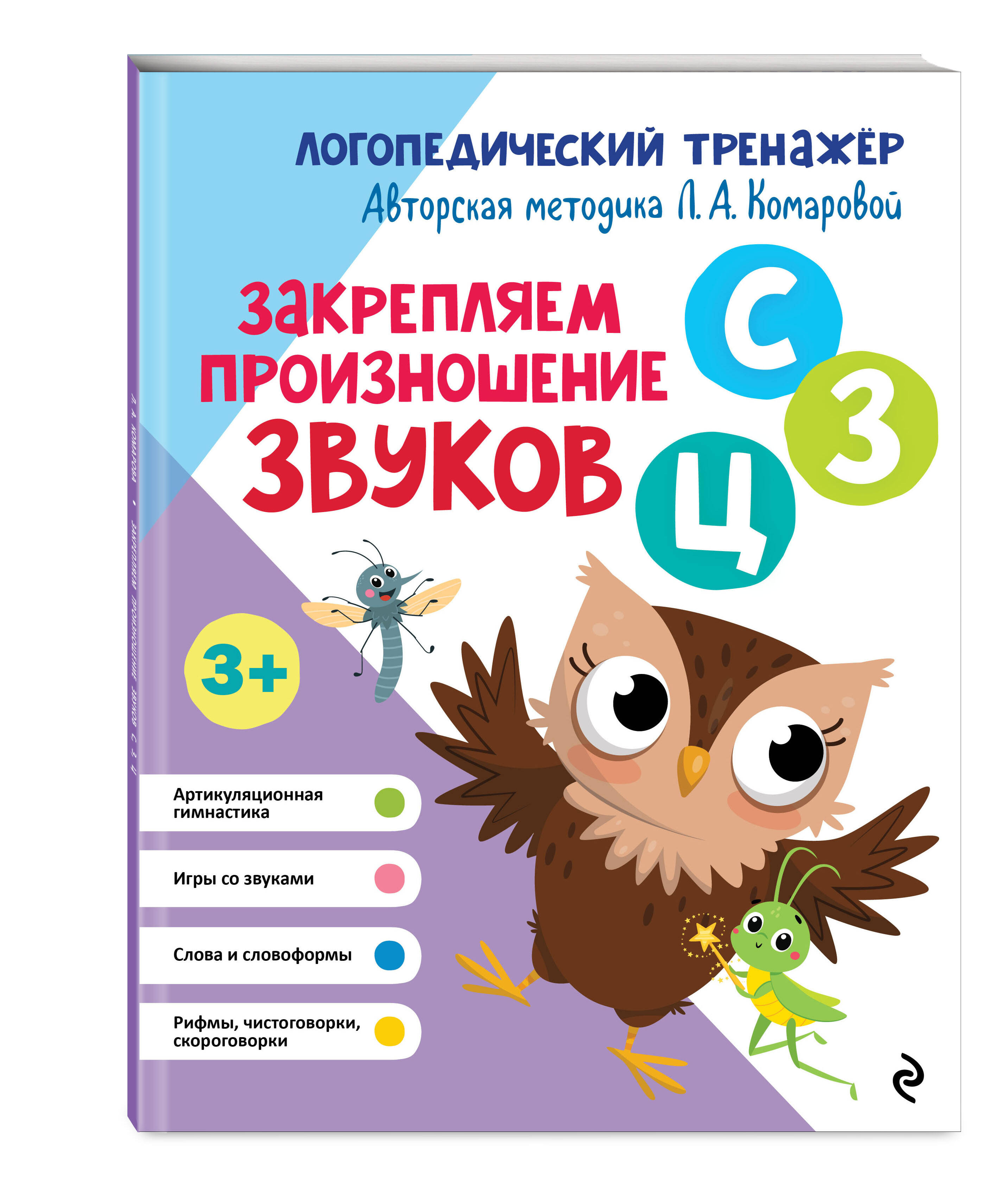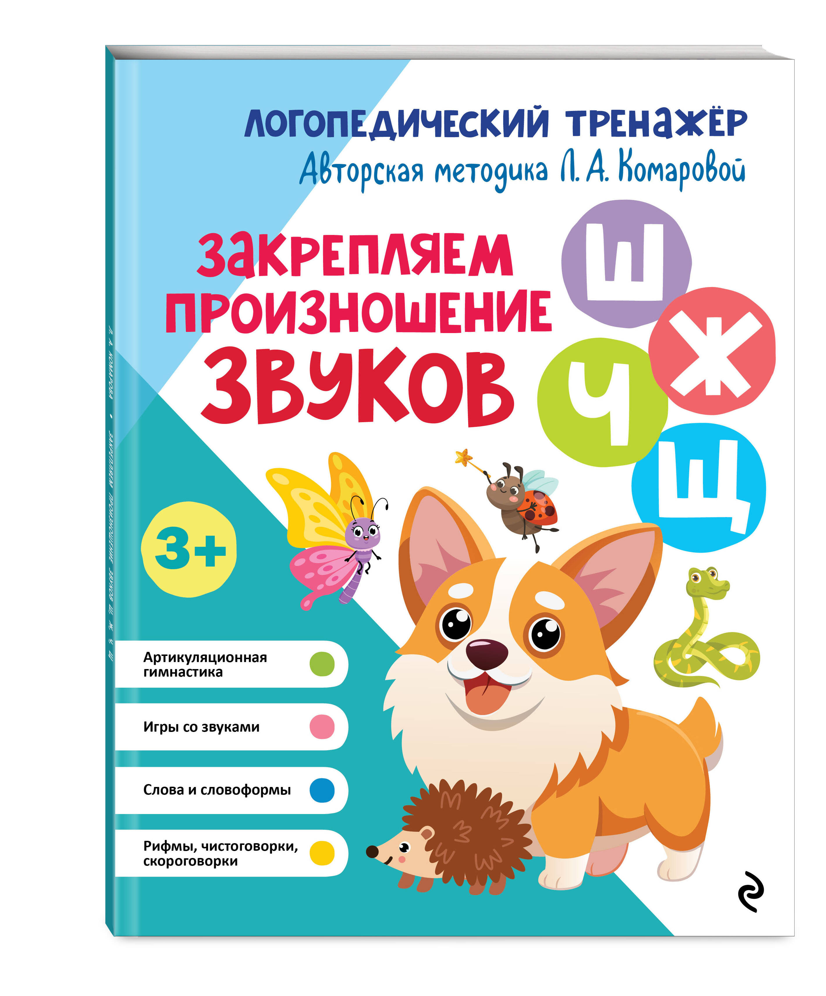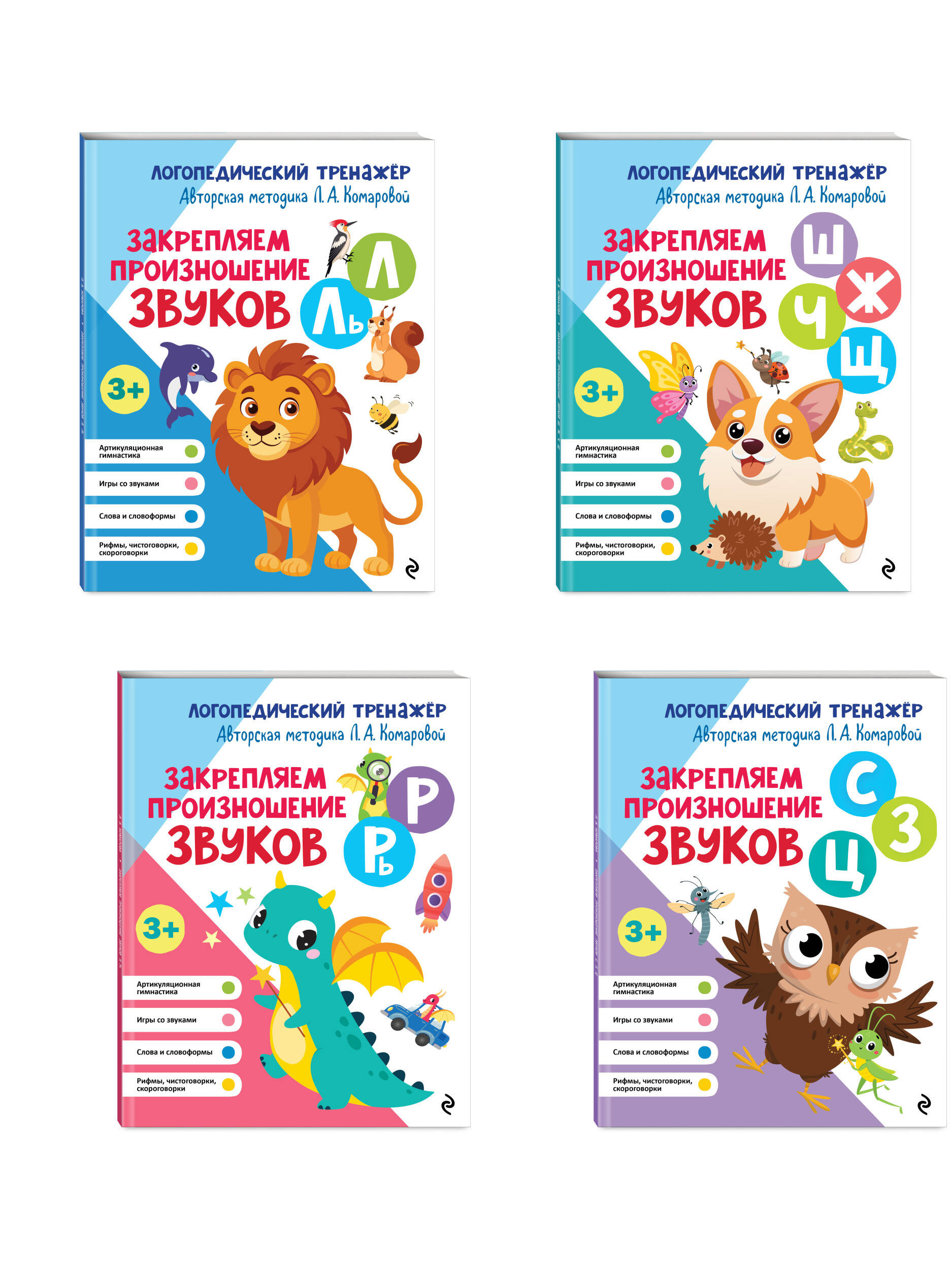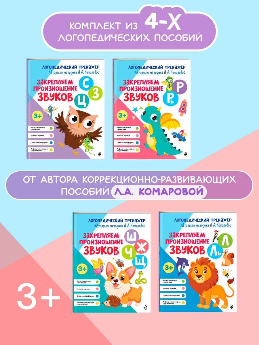 Комплект из 4-х логопедических тренажёров Л.А. Комаровой от издательства «Эксмо» — эффективная система занятий для автоматизации всех трудных звуков в речи ребёнка: шипящие [ш], [ж], [ч], [щ] (возраст нормы — 4—5 лет), свистящие [с], [з], [ц] (возраст нормы — 3—4 года), сонорные [р], [рь] (возраст нормы — 6—7 лет), сонорные [л], [ль] (возраст нормы — 5—6 лет).