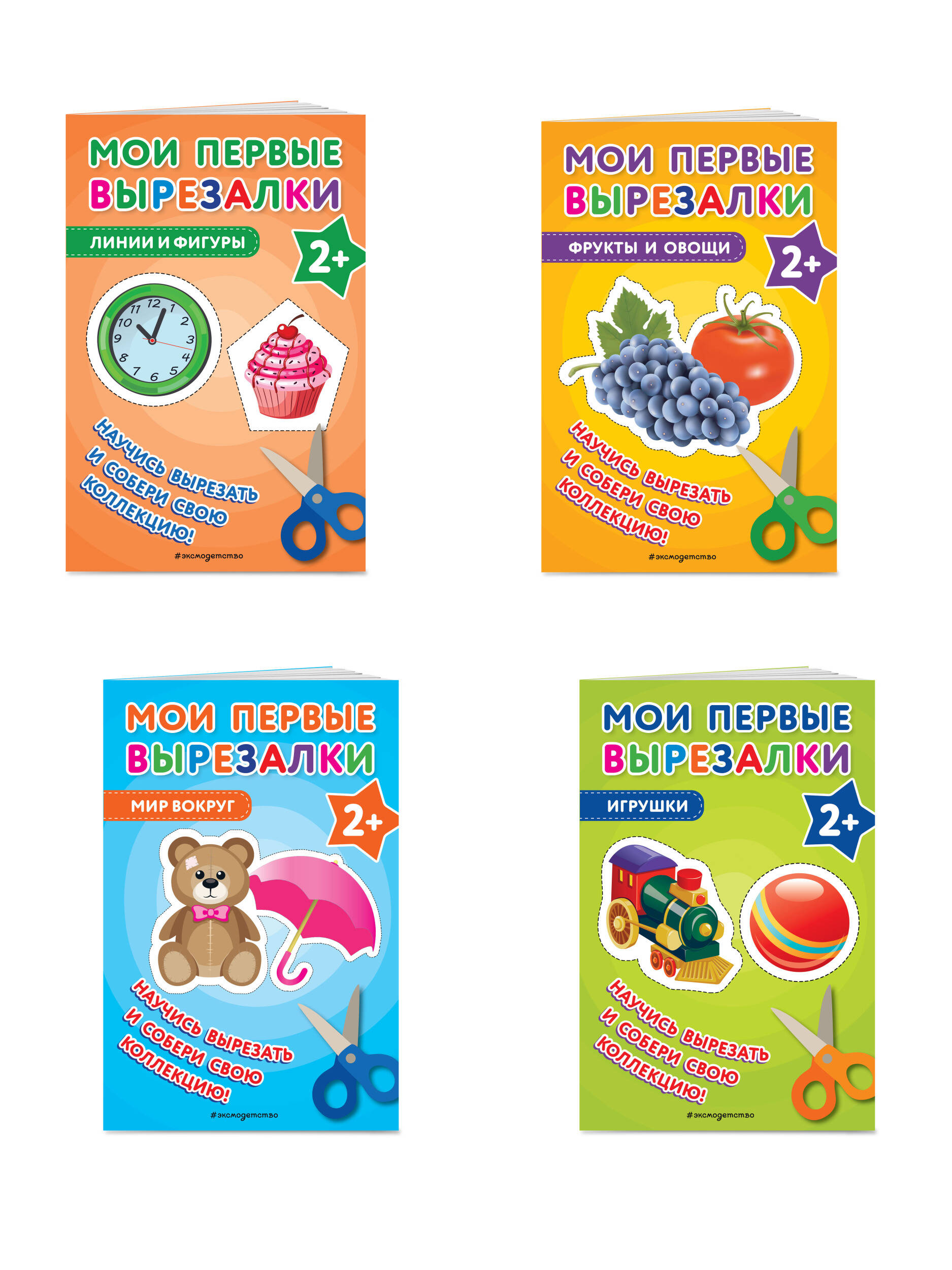 Комплект из 4-х книг: «Мои первые вырезалки. Фрукты и овощи» + «Мои первые вырезалки. Мир вокруг» + «Мои первые вырезалки. Линии и фигуры» + «Мои первые вырезалки. Игрушки».