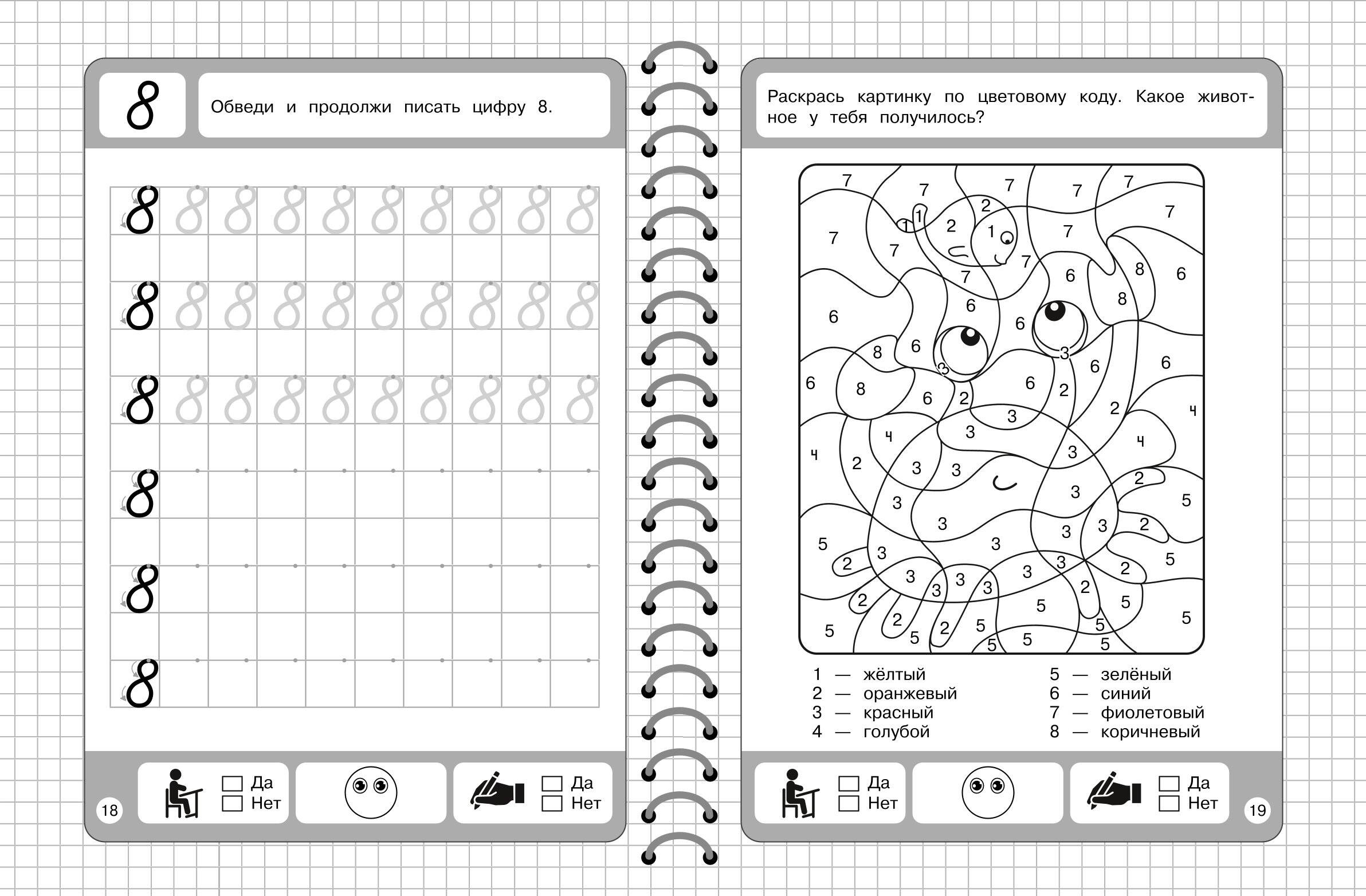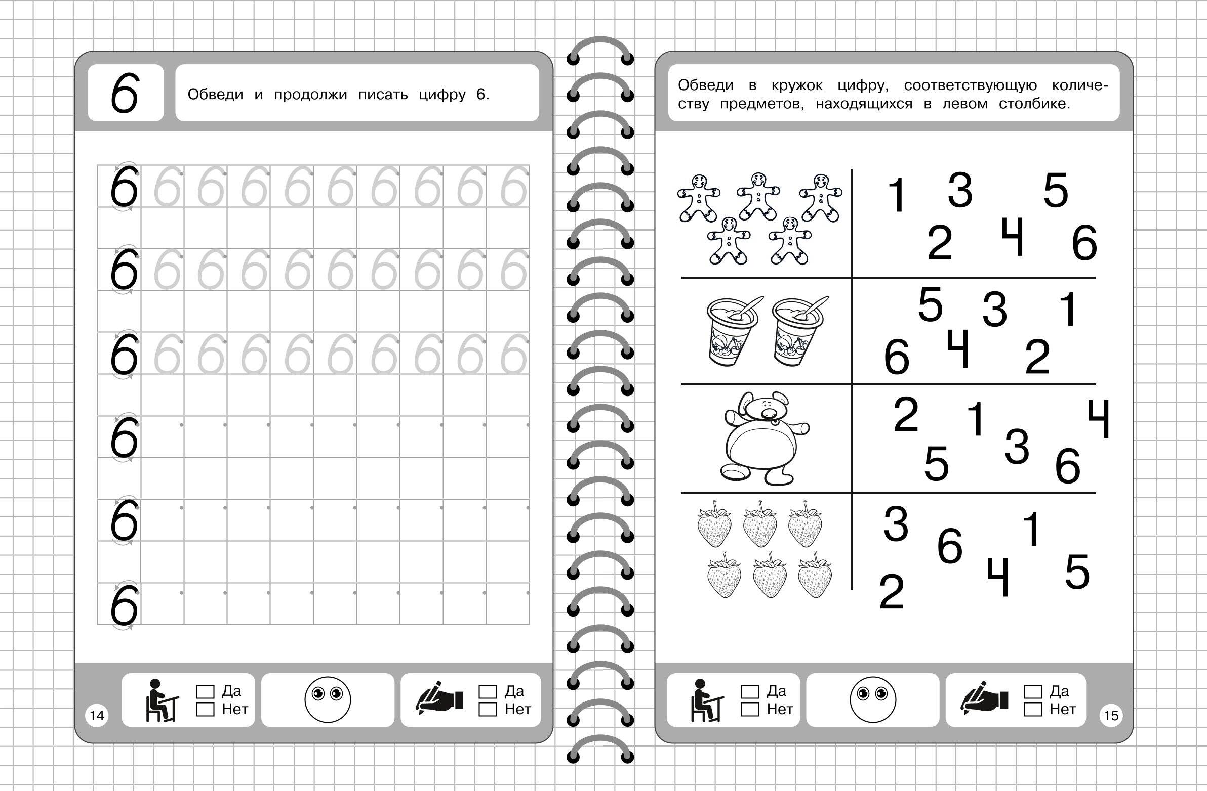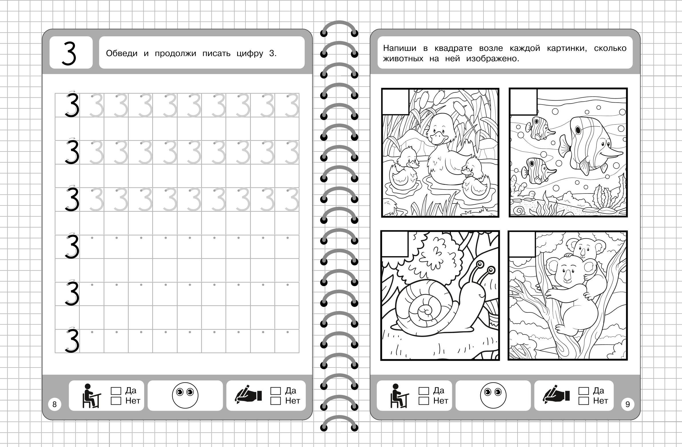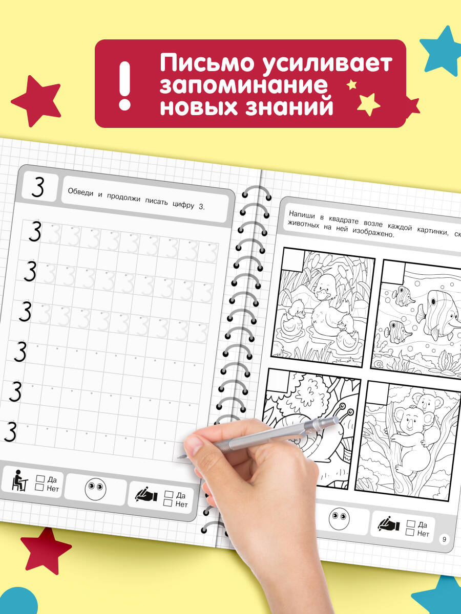 Книга издательства «Эксмо» — это настоящая находка для родителей, чьи дети скоро пойдут в 1 класс. Пособие, соответствующее ФГОС, четко структурировано и отлично подходит, чтобы начать обучение ребенка математике, так как первые математические знания дошкольник получает одновременно с развитием графических навыков. А написание цифр способствует их лучшему запоминанию. Крупные занимательные картинки будут мотивировать ребенка к занятиям. Занимаясь, дошкольник повторит цифры, научится соотносить цифру и число, познакомится с математическими символами. Внизу каждой страницы имеются значки для оценки выполненных заданий. Поставив галочку в клетках «да» или «нет», ребенок сможет проконтролировать себя, а нарисовав ротик у смайлика вверх или вниз — оценить результат (хорошо / не очень хорошо). Постоянная работа с пособием поможет дошкольнику развить мелкую моторику, графические навыки, внимание, творческие способности, стать более усидчивым и аккуратным.