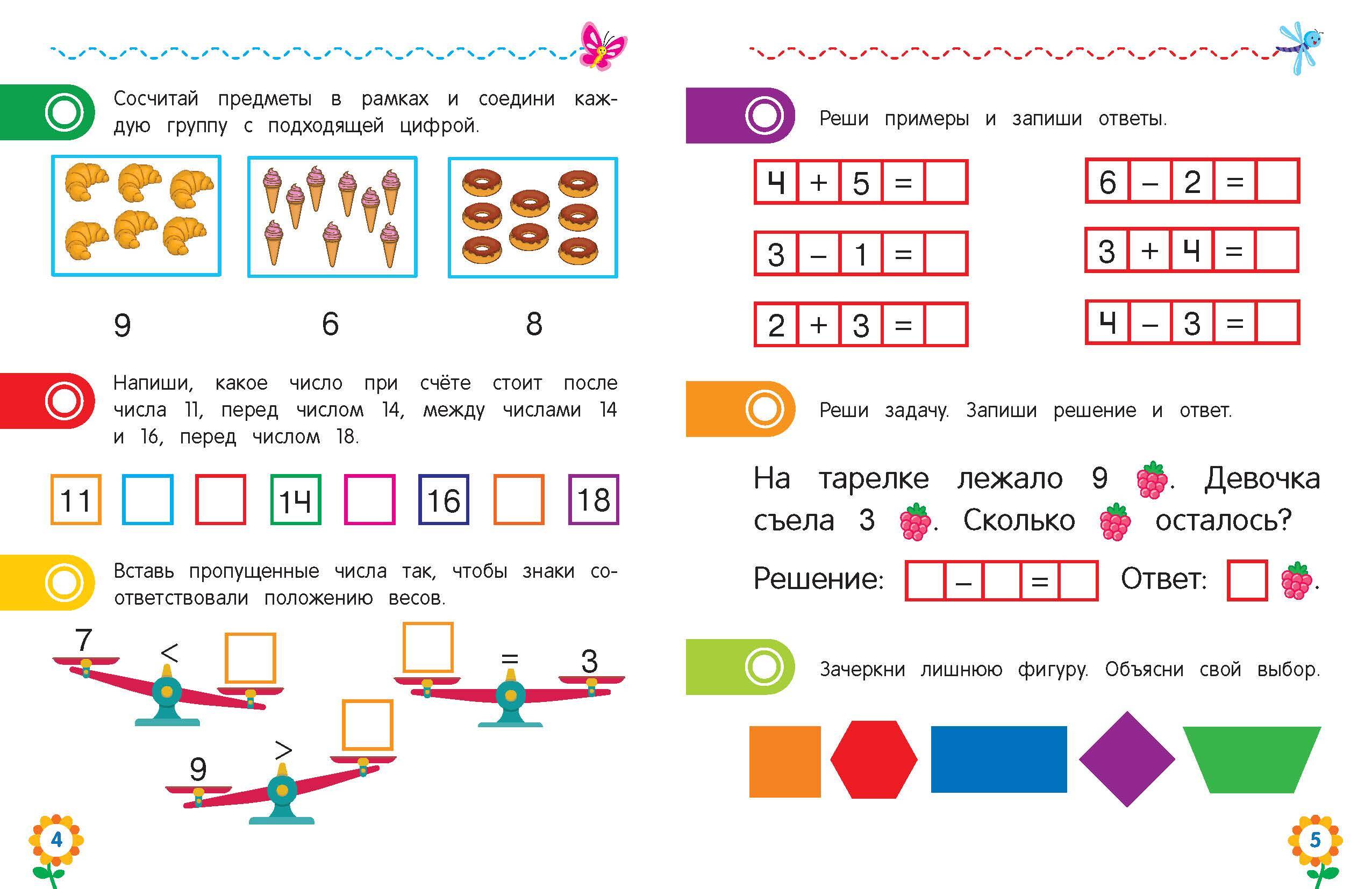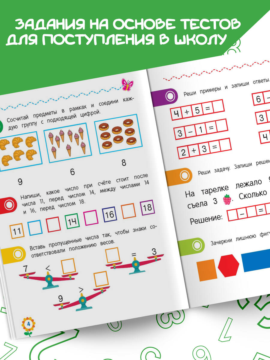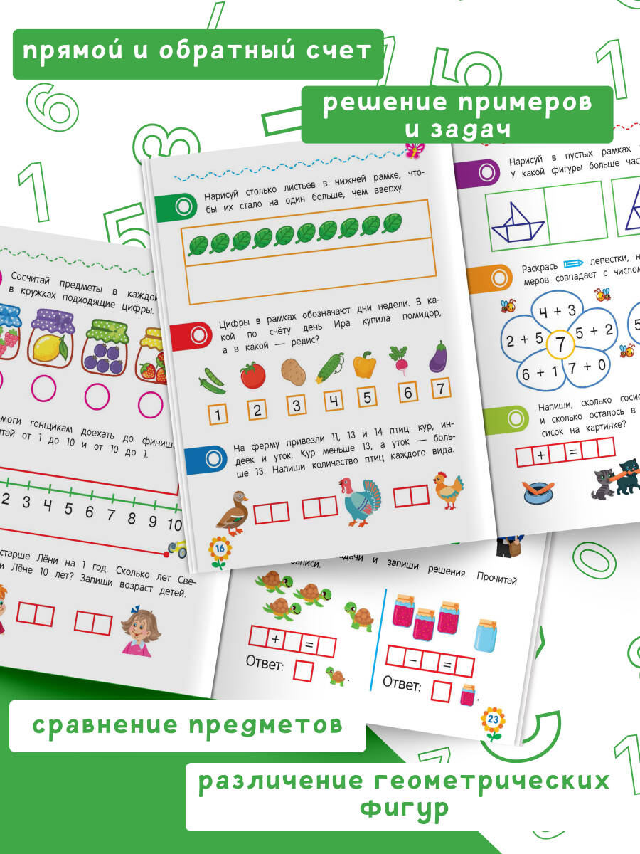 Поступление в 1-й класс — важнейший этап в жизни ребёнка, и к нему нужно хорошо подготовиться. Тренажёр включает в себя задания разного типа на проверку степени усвоения базовых математических понятий и умений, необходимых для дальнейшего изучения математики. С помощью пособия вы сможете проверить уровень сформированности первоначальных математических знаний будущего первоклассника: умеет ли он соотносить количество предметов с числом, считать в прямом и обратном порядке, сравнивать, вычитать и складывать числа, решать задачи, различать геометрические фигуры, ориентироваться на листе бумаги. Задания, представленные в тренажёре, помогут оценить способности ребёнка, определить, с чем он справляется успешно, и выделить те области, которые вызывают у него затруднения. Книга-развивашка от издательства «Эксмо» будет полезна девочкам и мальчикам 5, 6, 7 лет для подготовки к школе по математике. Рекомендуем также приобрести пособия: «Чтение», «Графические навыки», «Логическое мышление», «Внимание и память».
