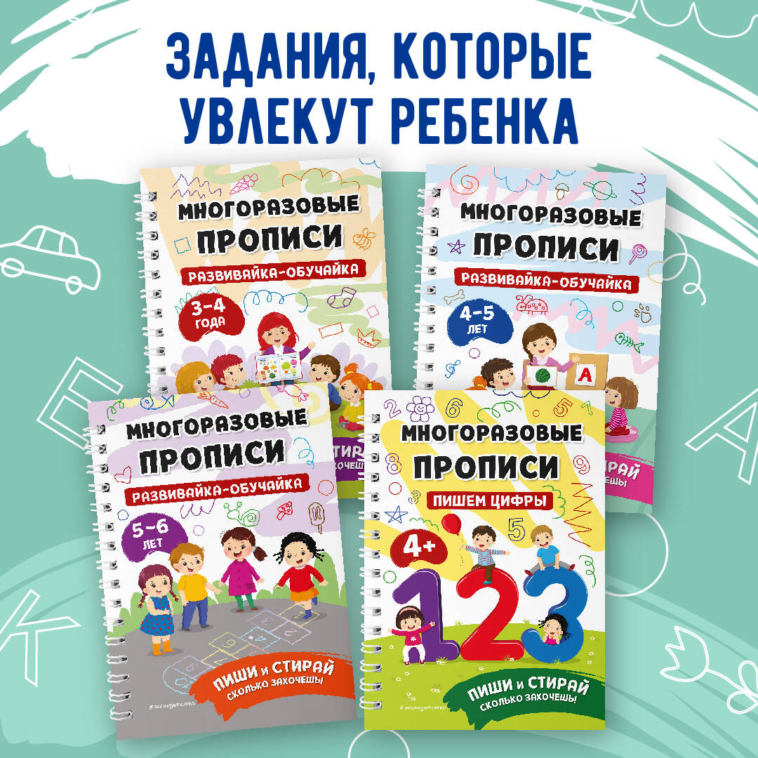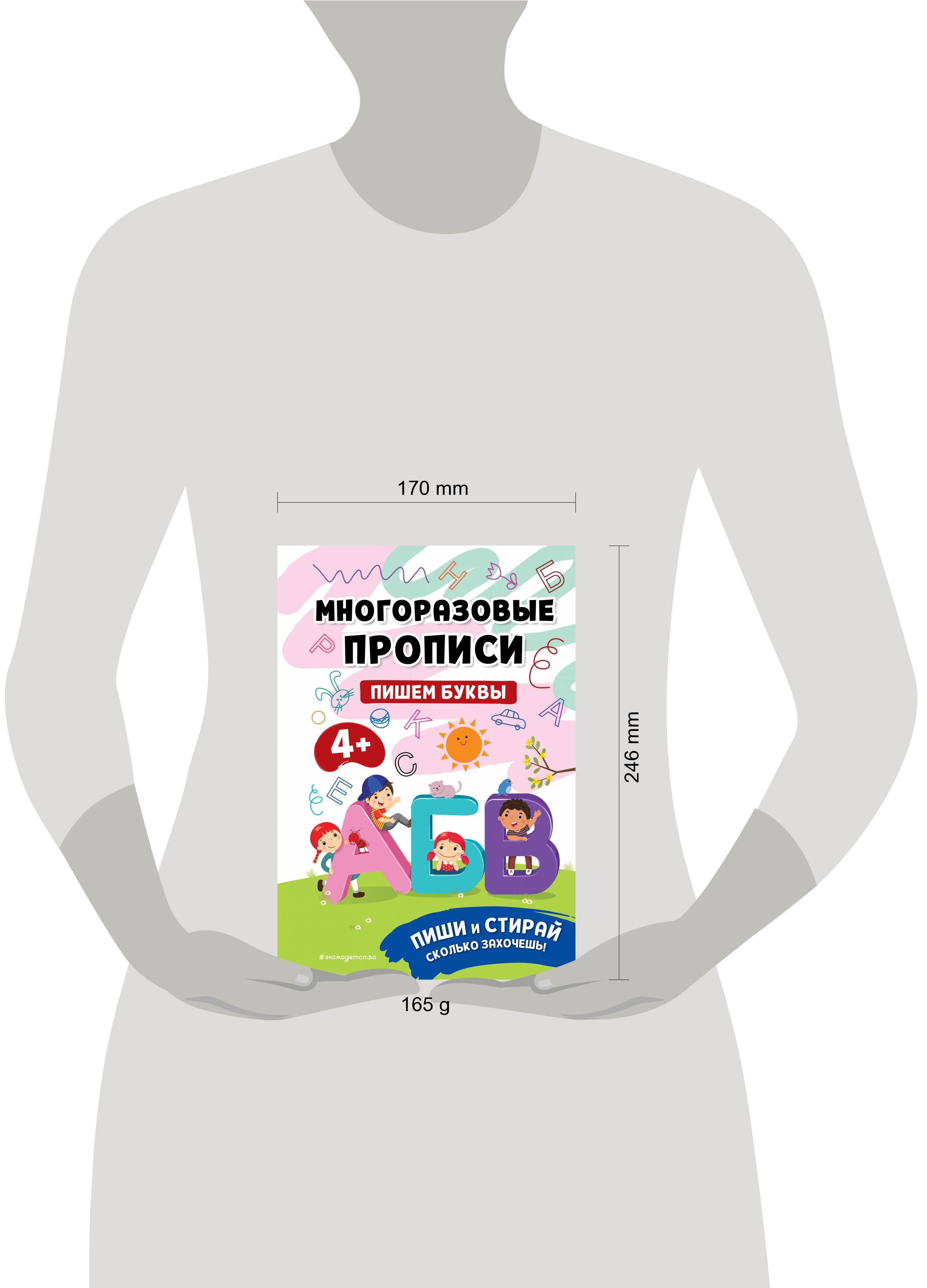 Многоразовые прописи для детей от 4 до 7 лет — уникальное пособие, которого хватит надолго! Дошкольник сможет писать и рисовать в тетради маркером или фломастером сколько угодно раз, а потом сам стирать написанное салфеткой. Выполняя увлекательные игровые задания, дошкольник научится писать буквы, короткие слова, разовьет внимание, логическое мышление, мелкую моторику рук, а также подготовит руку к письму. Размер пособия — немного больше ученической тетради и, по мнению психологов, идеален для детских занятий. Многоразовая развивающая тетрадь, которая не боится воды и устойчива к механическим воздействиям, станет любимой игрушкой вашего ребенка. Ее удобно брать с собой в дорогу и на дачу. Эта книжка-развивашка объединяет в себе полезные занятия и увлекательные задания. Пособие станет любимой игрушкой как мальчиков, так и девочек, и ребенок не захочет выпускать его из рук.