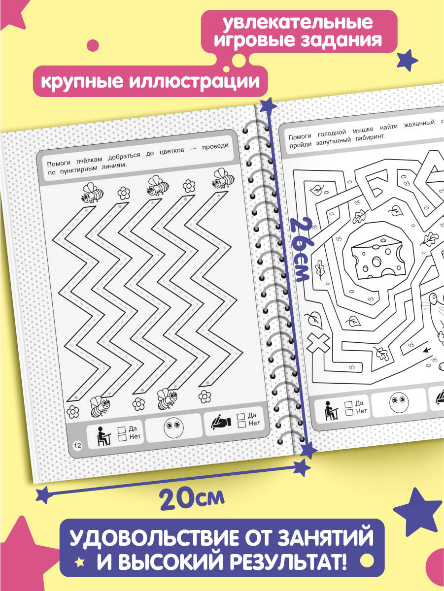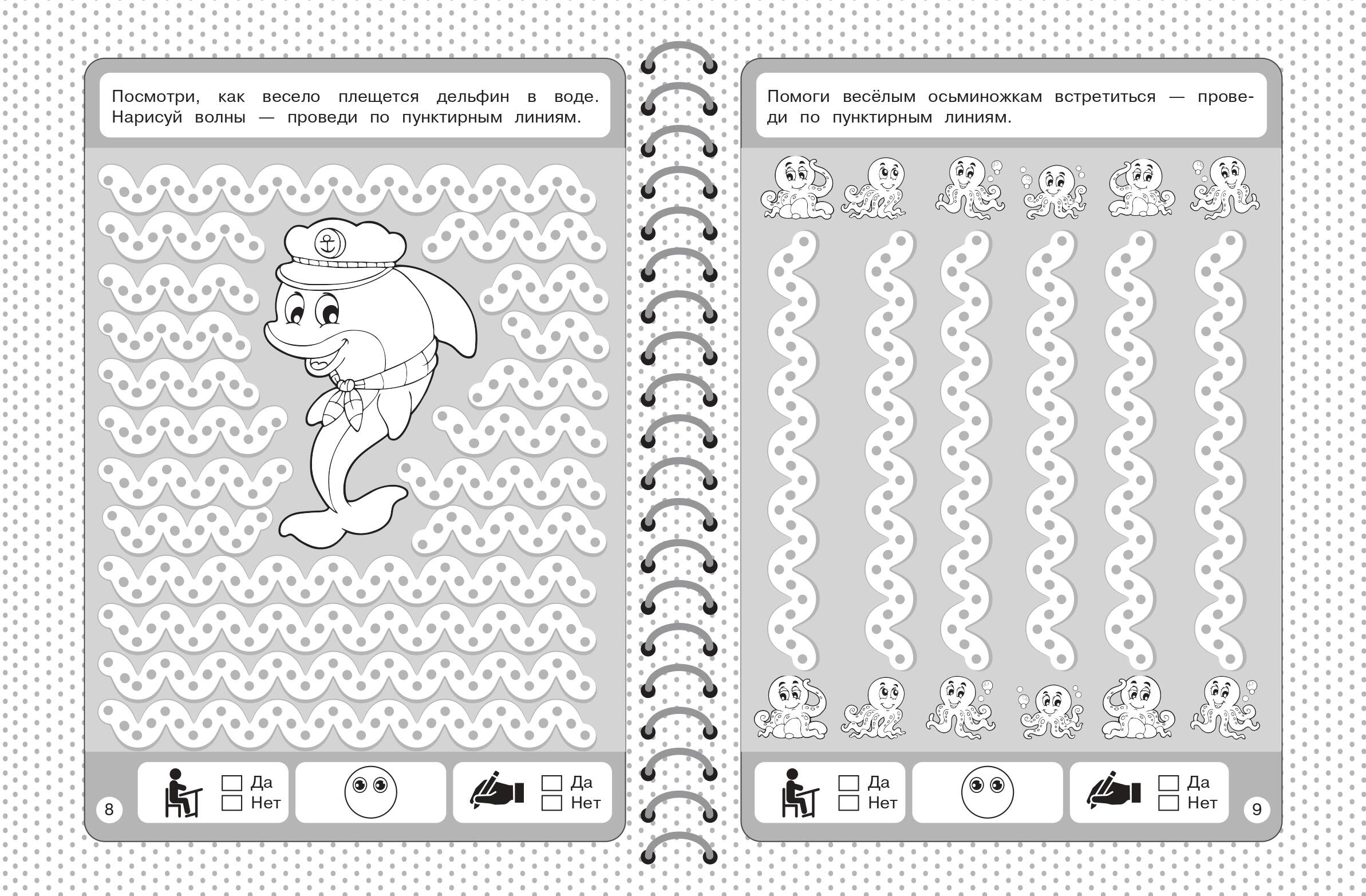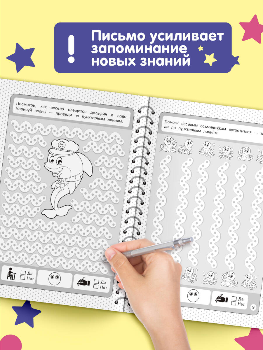 Книга издательства «Эксмо» — это настоящая находка для родителей, чьи дети скоро пойдут в 1 класс. Пособие, соответствующее ФГОС, четко структурировано и поможет быстро и качественно подготовить руку ребенка к письму. Крупные занимательные картинки будут мотивировать ребенка. Занимаясь, дошкольник будет аккуратно обводить по пунктиру и проводить разные типы линий, штриховать, проходить лабиринты, рисовать по точкам и клеткам, дорисовывать половинки предметов. Внизу каждой страницы имеются значки для оценки выполненных заданий. Поставив галочку в клетках «да» или «нет», ребенок сможет проконтролировать себя, а нарисовав ротик у смайлика вверх или вниз — оценить результат (хорошо / не очень хорошо). Постоянная работа с пособием поможет дошкольнику развить мелкую моторику, графические навыки, внимание, творческие способности, стать более усидчивым и аккуратным.