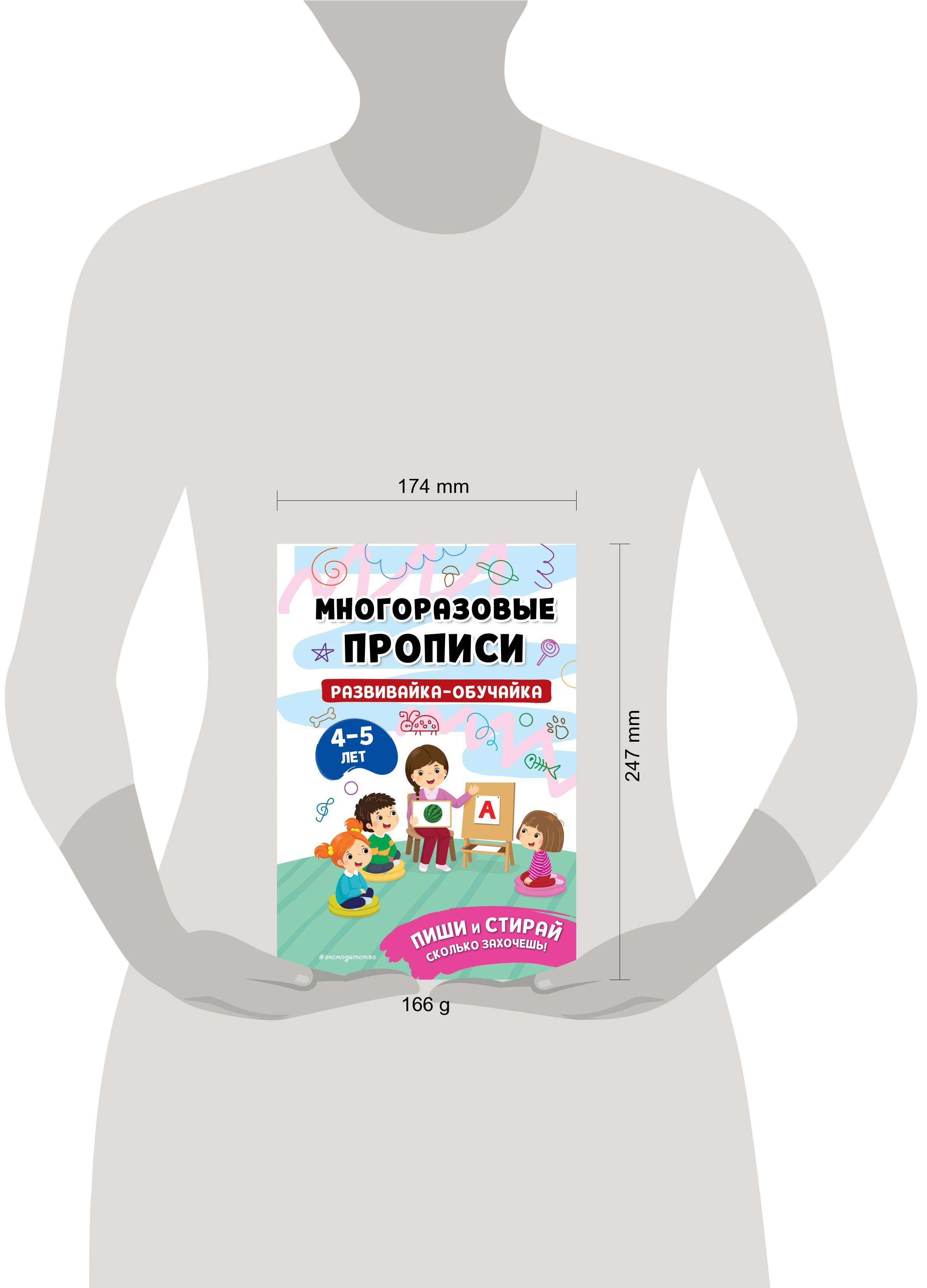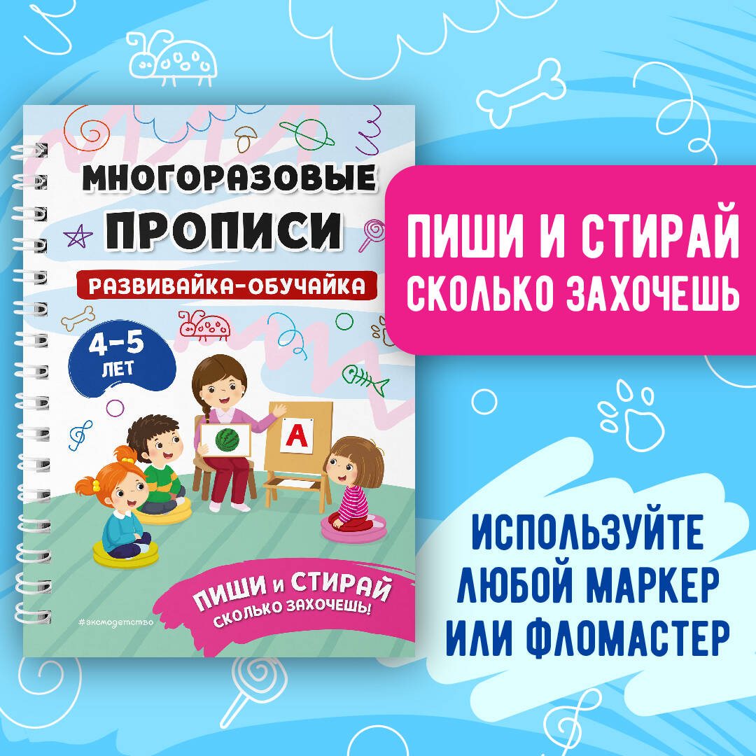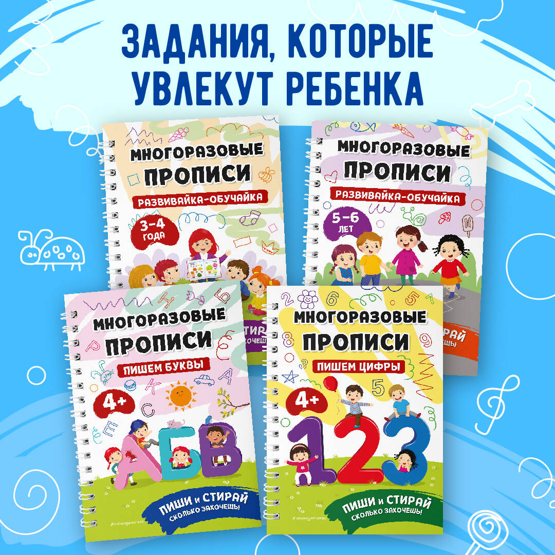 Многоразовые прописи для детей от 4 до 5 лет — уникальное пособие, которого хватит надолго! Дошкольник сможет писать и рисовать в тетради маркером или фломастером сколько угодно раз, а потом сам стирать написанное салфеткой. Выполняя увлекательные игровые задания, он не только развивает мозг малыша и мелкую моторику, но и учится считать до десяти, писать цифры, печатные буквы русского алфавита и короткие слова, запоминает геометрические фигуры, развивает внимание и логическое мышление. Размер пособия — немного больше ученической тетради и, по мнению психологов, идеален для развивающих занятий и детских игр. Эти многоразовые прописи — отличные товары для детей от 4 лет и замечательные подарки для девочек и мальчиков. Пособие станет любимой игрушкой вашего ребенка, он не захочет выпускать его из рук.