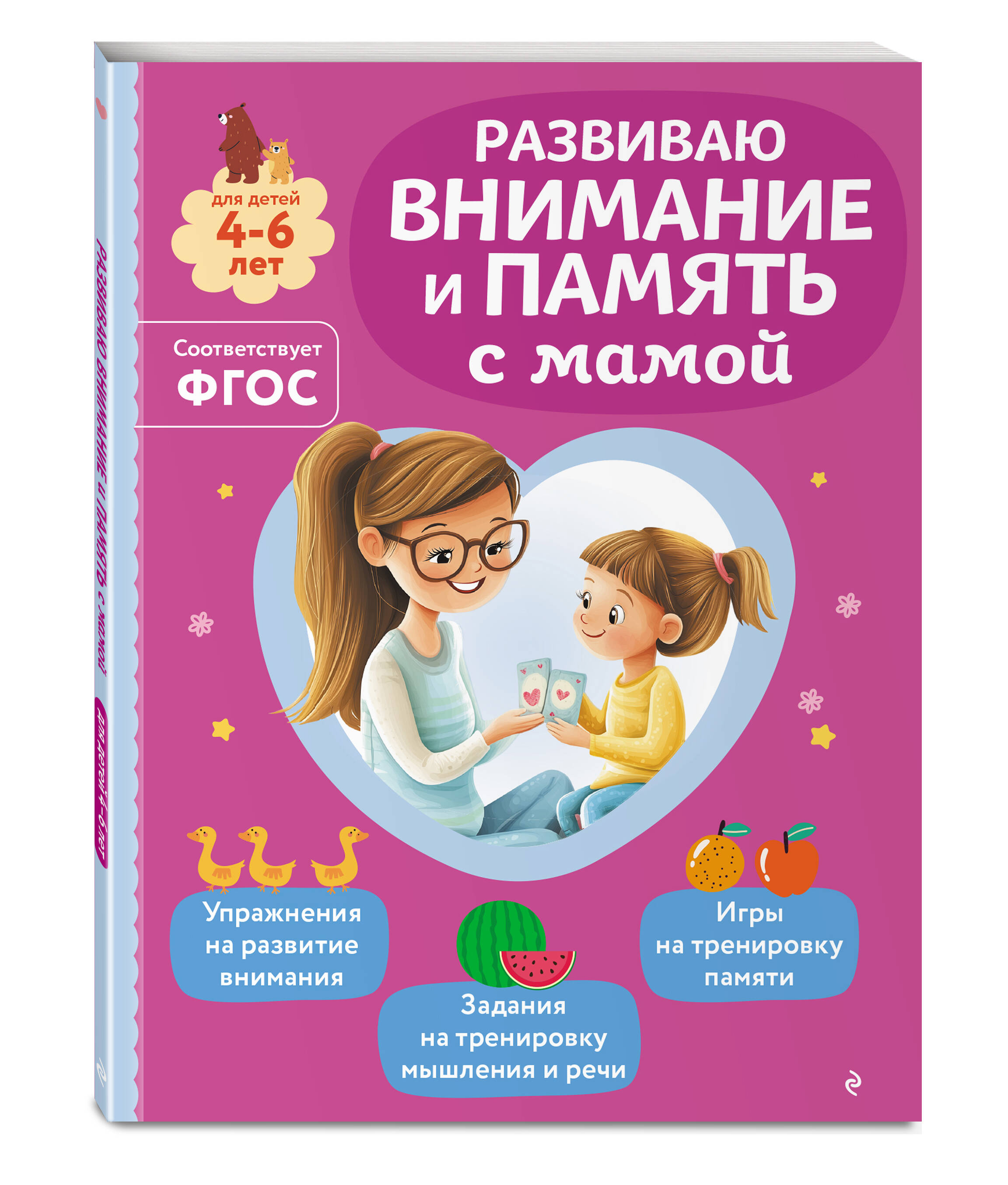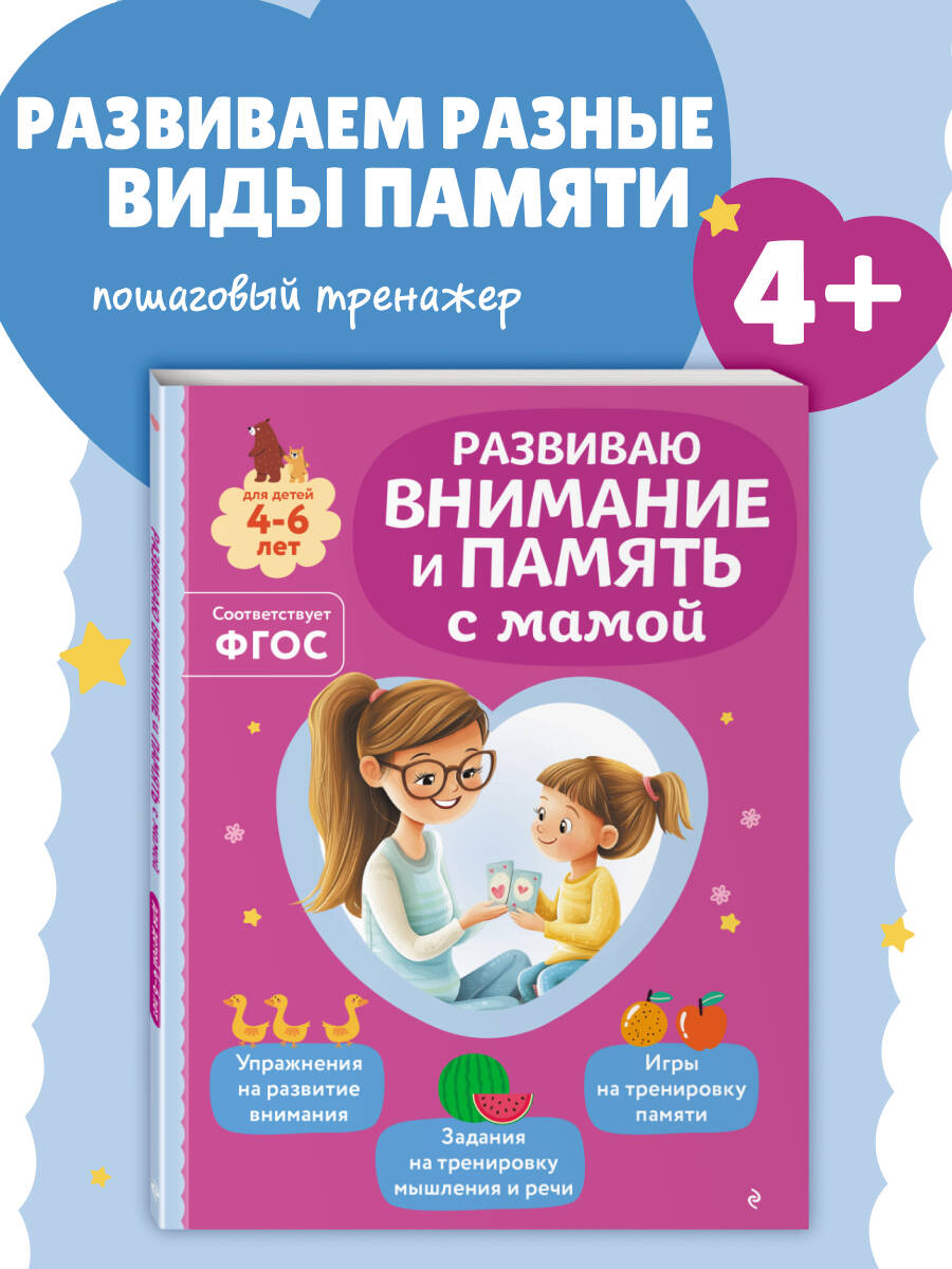 Развитие внимания и памяти — важная часть подготовки к будущему обучению, и развивать их нужно как можно раньше. В нашем пособии мальчики и девочки найдут разноплановые игровые задания, направленные на быстрое усовершенствование этих функций, а также тренировку мышления и речи. Занимаясь, ребенок будет находить отличия на картинках, учить наизусть забавные стихотворения, искать лишний предмет, определять, какая часть подходит к целому изображению, соединять предметы с их тенью, подбирать смысловые пары. Вместе с этим пособием каждое занятие превратится в интересное приключение, и ребёнок не заметит, как пролетит время. Книга-развивашка, предназначенная для совместных занятий мамы и ребёнка, станет надежным помощником в процессе подготовки к школе. Простые задания легко выполнять дома, на прогулке или в дороге. Обучение, проходящее в виде веселой увлекательной игры, поможет ребенку не только развить ключевые навыки, но и почувствовать уверенность в своих силах. Развивающее пособие идеально подойдет для занятий с детьми 4, 5, 6 лет, так как учитывает их особенности восприятия и интересы. Рекомендуем также приобрести другие книги серии: «Читаем вместе с мамой», «Считаем вместе с мамой», «Пишем вместе с мамой», «Развиваем логику вместе с мамой».