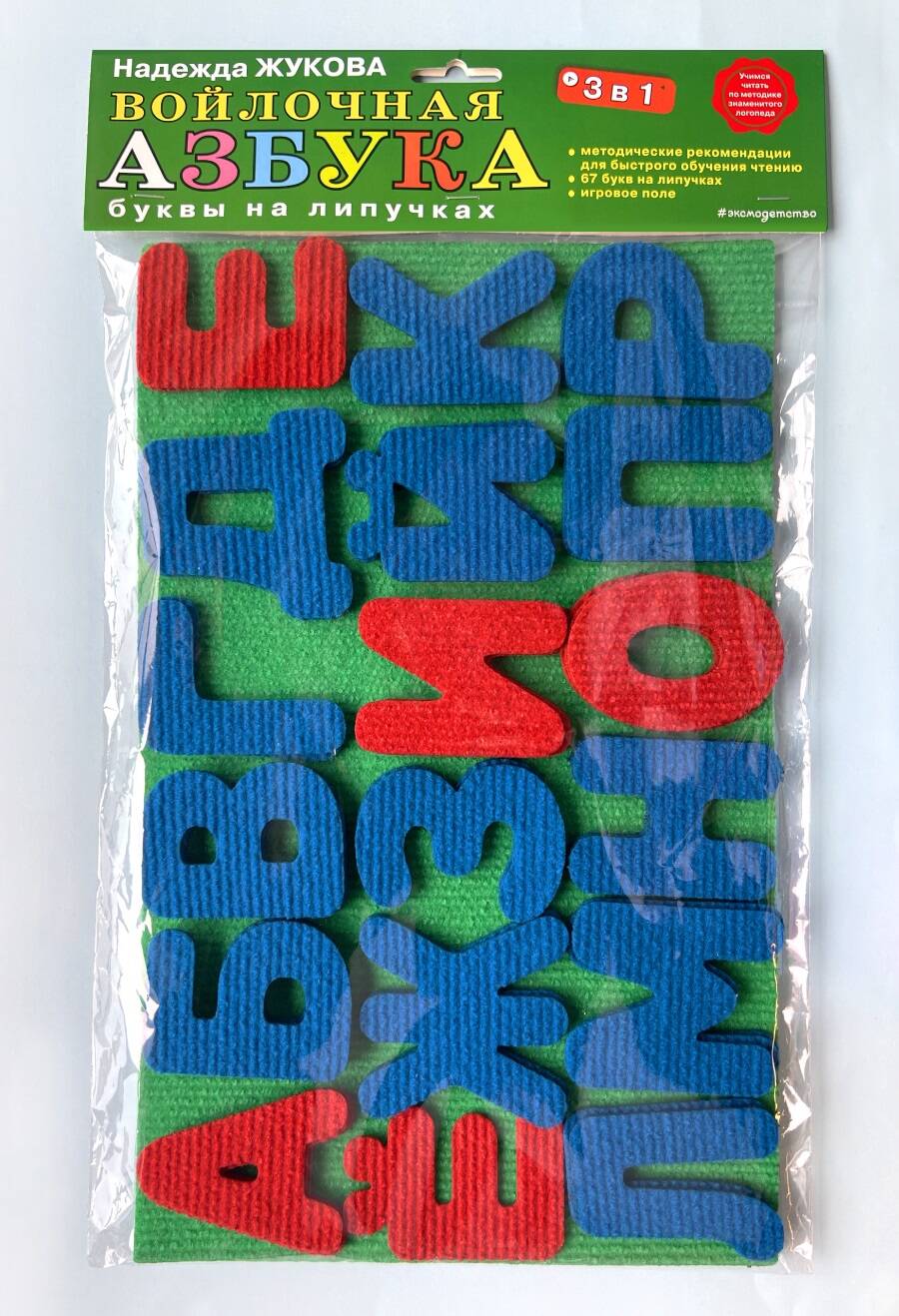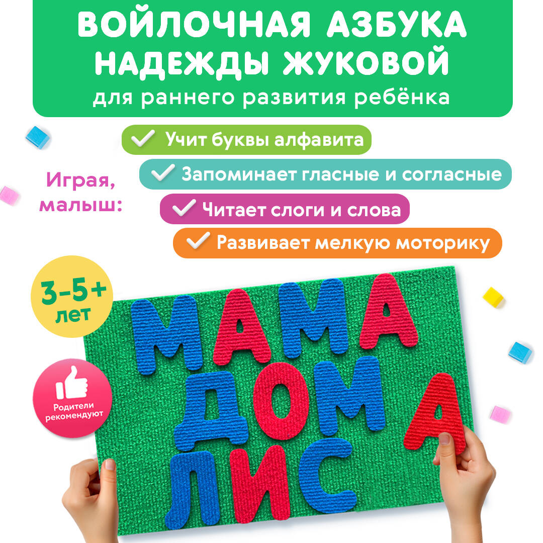 Новинка среди развивающих пособий от Надежды Жуковой! Развивашка для малышей - интересное обучение ребенка в игровом формате! «Войлочная азбука. Буквы на липучках» для детей 3-5 лет поможет выучить алфавит в игровой форме быстро и легко, сделать первые шаги в обучении чтению, развитию речи и мелкой моторики. В комплекте развивающей игрушки: игровое поле, 67 больших букв (алфавит из 33 гласных и согласных букв и 34 дополнительных, самых употребляемых), инструкция с логопедическими советами, методическими рекомендациями и уникальным комплексом упражнений от известного логопеда. Войлочная азбука с крупными буквами сделана из качественного и безопасного материала, его сложно порвать, а липучки гарантируют удобство в креплении букв к полю. Мягкая азбука идеально подойдет для развития детей в 3 года! С помощью этого комплекта ребенок составит свои первые слова. Мягкий алфавит для малышей намного безопаснее деревянного алфавита. «Войлочная азбука» станет первым этапом в развитии ребенка, после которого можно перейти к «Магнитной азбуке», и следом к легендарному «Букварю» Надежды Жуковой. Так малыш научится читать слоги и слова значительно быстрее сверстников! Эта азбука станет отличным подарком для мальчиков и девочек. Учим буквы эффективно по методике Надежды Жуковой!