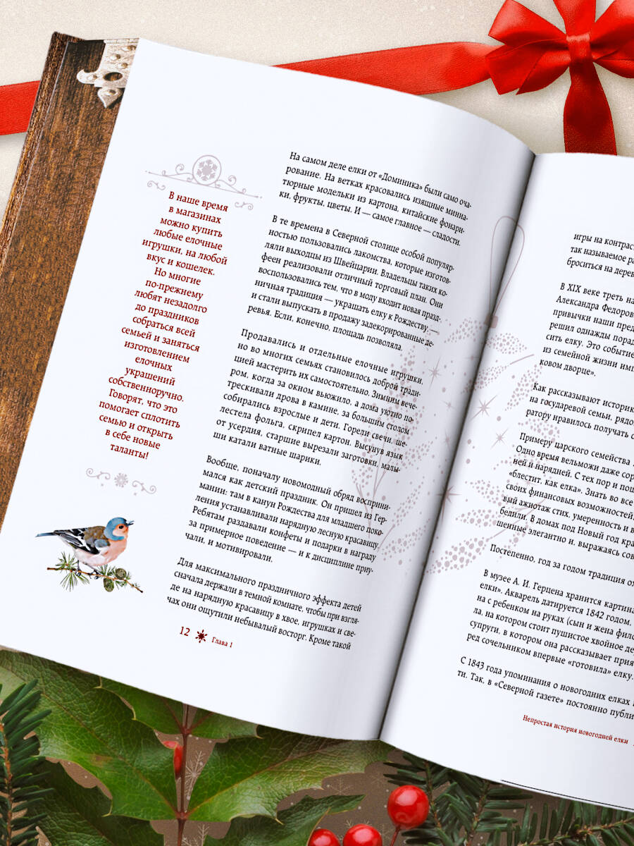 В этой подарочной книге с закрашенным обрезом и уникальным оформлением в виде коробки с елочными игрушками вас ждет особая, неповторимая атмосфера новогоднего праздника: запах хвои и мандаринов, мерцание гирлянд и елочных игрушек, горы подарков под елкой и аромат рождественского пирога.