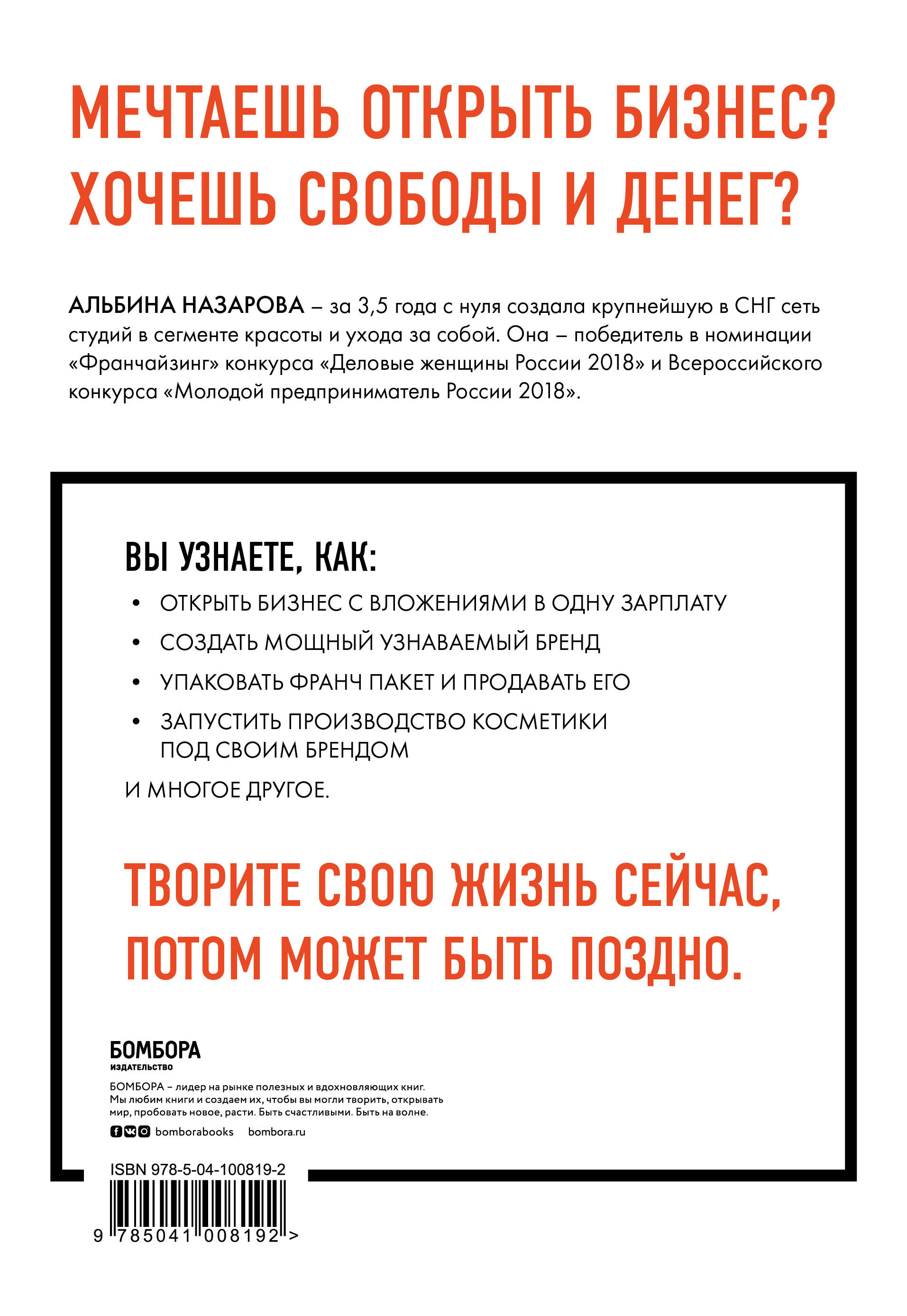Пособие по открытию своего дела от Альбины Назаровой, которая с нуля за 3,5 года создала крупнейшую в СНГ сеть салонов красоты. Автор рассказала, как основать стартап с вложениями в одну зарплату, упаковать франч-пакет и продать его, запустить производство косметики под своим брендом.