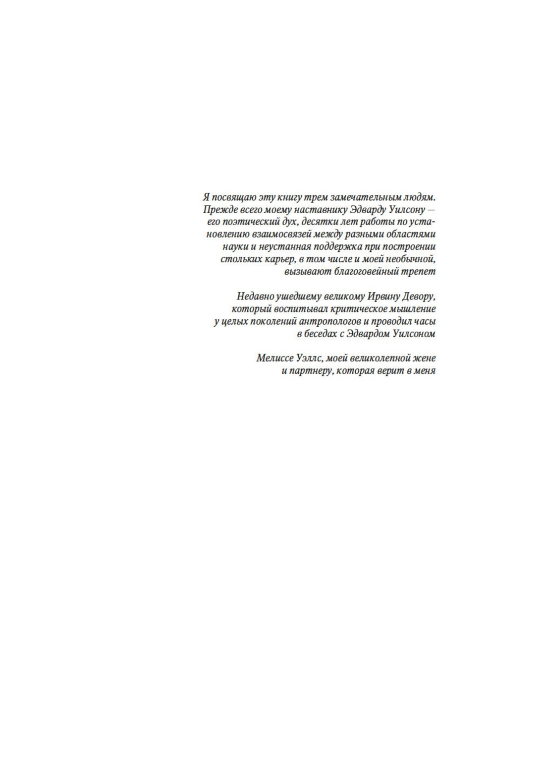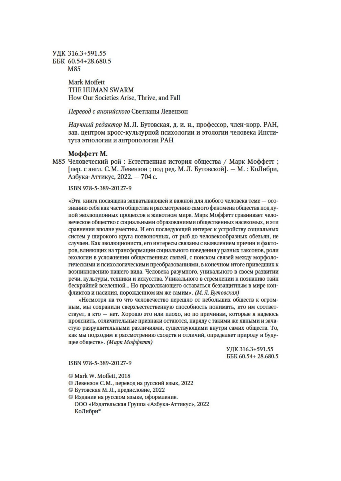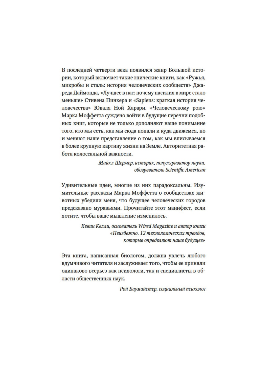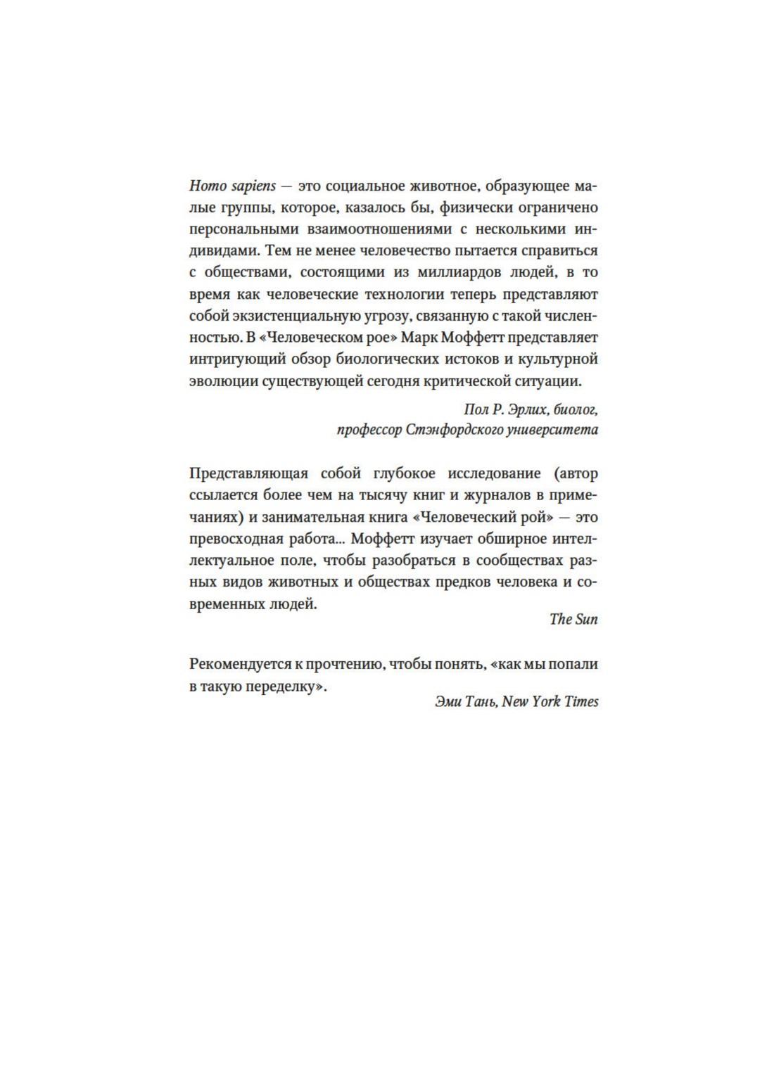 «Эта книга посвящена захватывающей и важной для любого человека теме — осознанию себя как части общества и рассмотрению самого феномена общества под лупой эволюционных процессов в животном мире. Марк Моффетт сравнивает человеческое общество с социальными образованиями общественных насекомых, и эти сравнения вполне уместны. И его последующий интерес к устройству социальных систем у широкого круга позвоночных, от рыб до человекообразных обезьян, не случаен. Как эволюциониста, его интересы связаны с выявлением причин и факторов, влияющих на трансформации социального поведения у разных таксонов, роли экологии в усложнении общественных связей, с поиском связей между морфологическими и психологическими преобразованиями, в конечном итоге приведших к возникновению нашего вида. Человека разумного, уникального в своем развитии речи, культуры, техники и искусства. Уникального в стремлении к познанию тайн бескрайней вселенной… Но продолжающего оставаться беззащитным в мире конфликтов и насилия, порожденном им же самим». (М. Л. Бутовская)