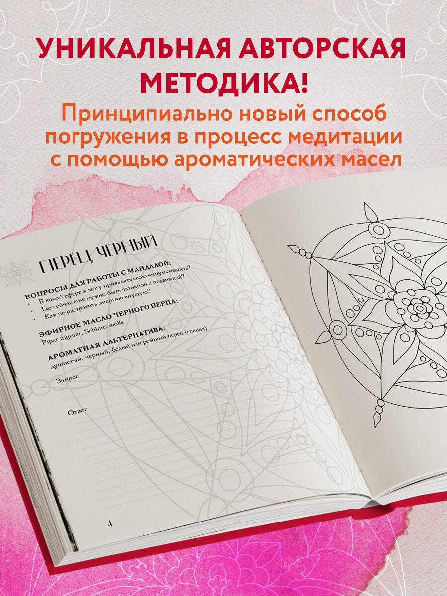 По мере раскрашивания мандал вы сможете не только проработать личные барьеры, повысить уровень энергии и составить план самореализации, но и вдохнете тонкие и ненавязчивые ароматы, которые помогут вам быстрее расслабиться. А составленный автором список масел усилит эффект от работы с конкретным запросом.