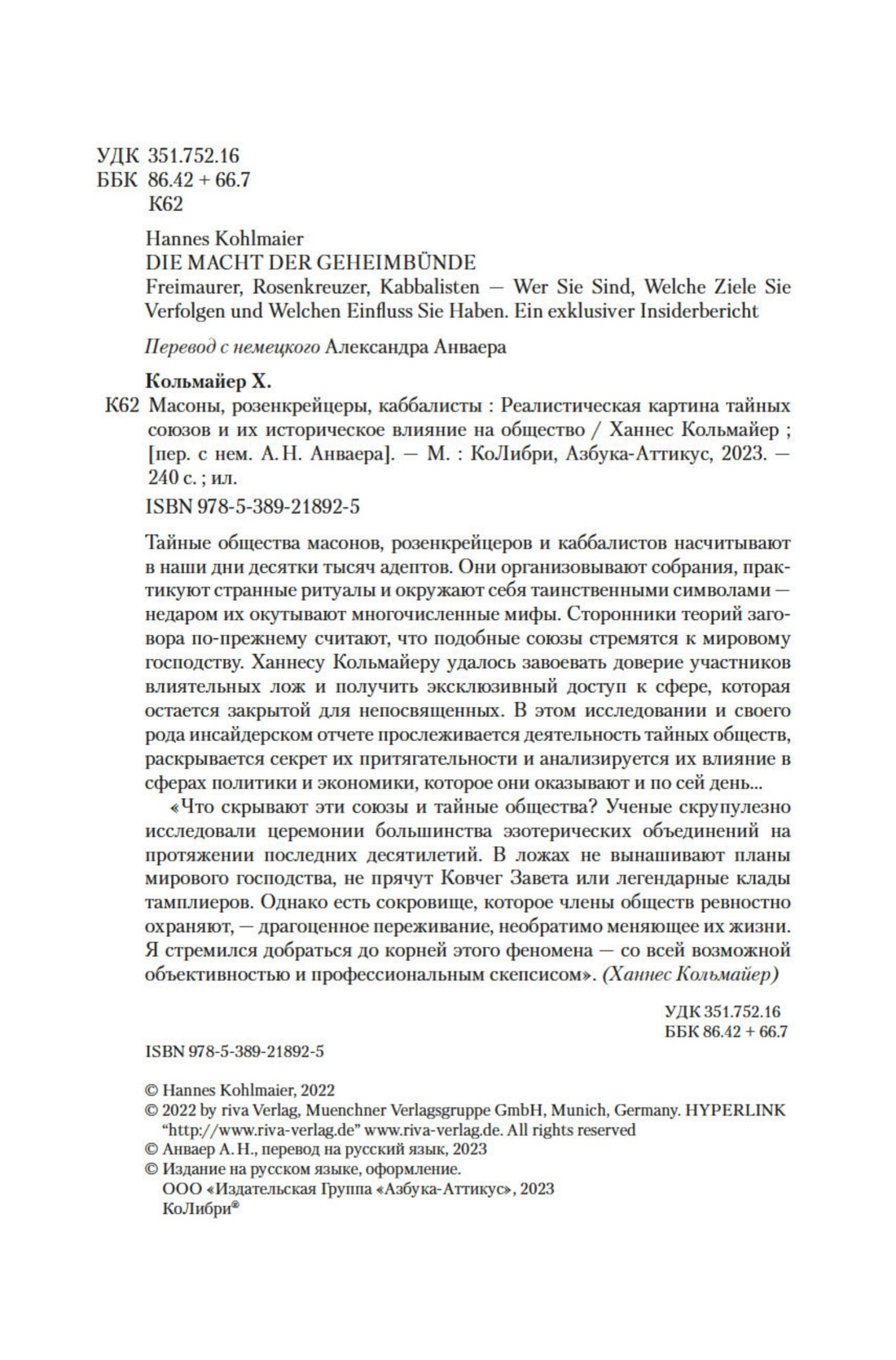 Тайные общества масонов, розенкрейцеров и каббалистов насчитывают в наши дни десятки тысяч адептов. Они организовывают собрания, практикуют странные ритуалы и окружают себя таинственными символами — недаром их окутывают многочисленные мифы. Сторонники теорий заговора по-прежнему считают, что подобные союзы стремятся к мировому господству. Ханнесу Кольмайеру удалось завоевать доверие участников влиятельных лож и получить эксклюзивный доступ к сфере, которая остается закрытой для непосвященных. В этом исследовании и своего рода инсайдерском отчете прослеживается деятельность тайных обществ, раскрывается секрет их притягательности и анализируется их влияние в сферах политики и экономики, которое они оказывают и по сей день…