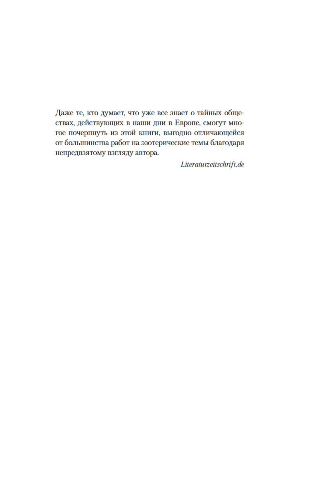 «Что скрывают эти союзы и тайные общества? Ученые скрупулезно исследовали церемонии большинства эзотерических объединений на протяжении последних десятилетий. В ложах не вынашивают планы мирового господства, не прячут Ковчег Завета или легендарные клады тамплиеров. Однако есть сокровище, которое члены обществ ревностно охраняют, — драгоценное переживание, необратимо меняющее их жизни. Я стремился добраться до корней этого феномена — со всей возможной объективностью и профессиональным скепсисом». (Ханнес Кольмайер)