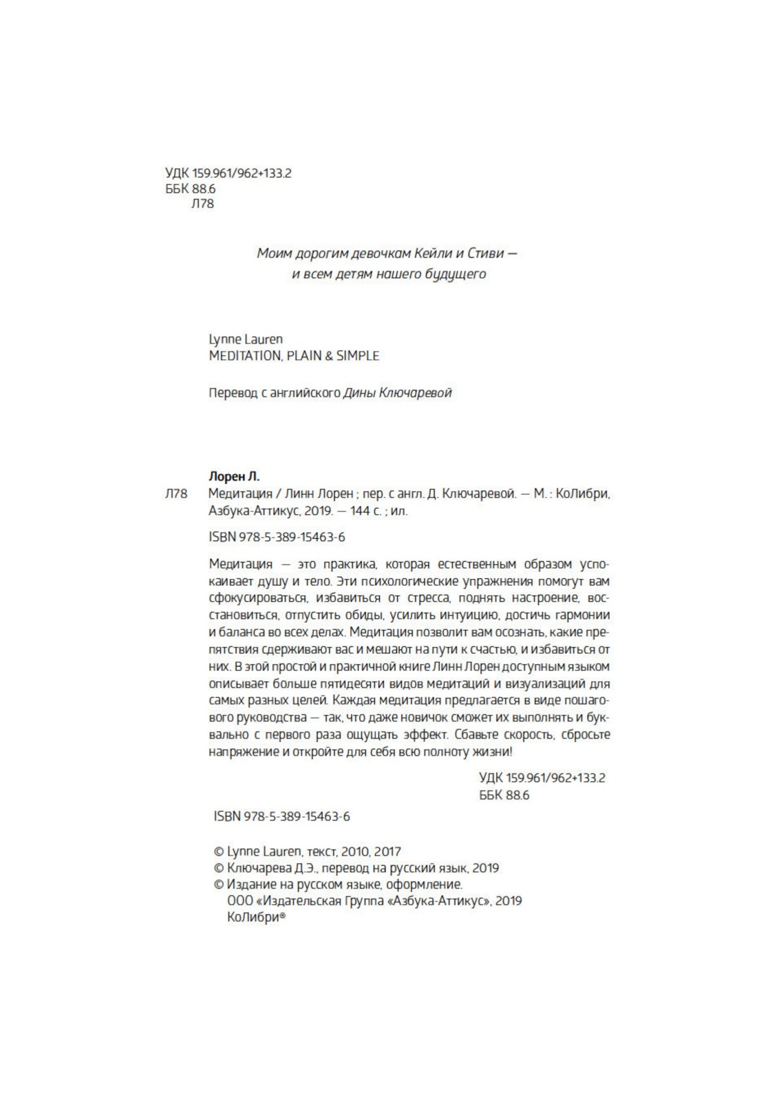 Медитация — это практика, которая естественным образом успокаивает душу и тело. Эти психологические упражнения помогут вам сфокусироваться, избавиться от стресса, поднять настроение, восстановиться, отпустить обиды, усилить интуицию, достичь гармонии и баланса во всех делах. Медитация позволит вам осознать, какие препятствия сдерживают вас и мешают на пути к счастью, и избавиться от них. В этой простой и практичной книге Линн Лорен доступным языком описывает больше пятидесяти видов медитаций и визуализаций для самых разных целей. Каждая медитация предлагается в виде пошагового руководства — так, что даже новичок сможет их выполнять и буквально с первого раза ощущать эффект. Сбавьте скорость, сбросьте напряжение и откройте для себя всю полноту жизни!