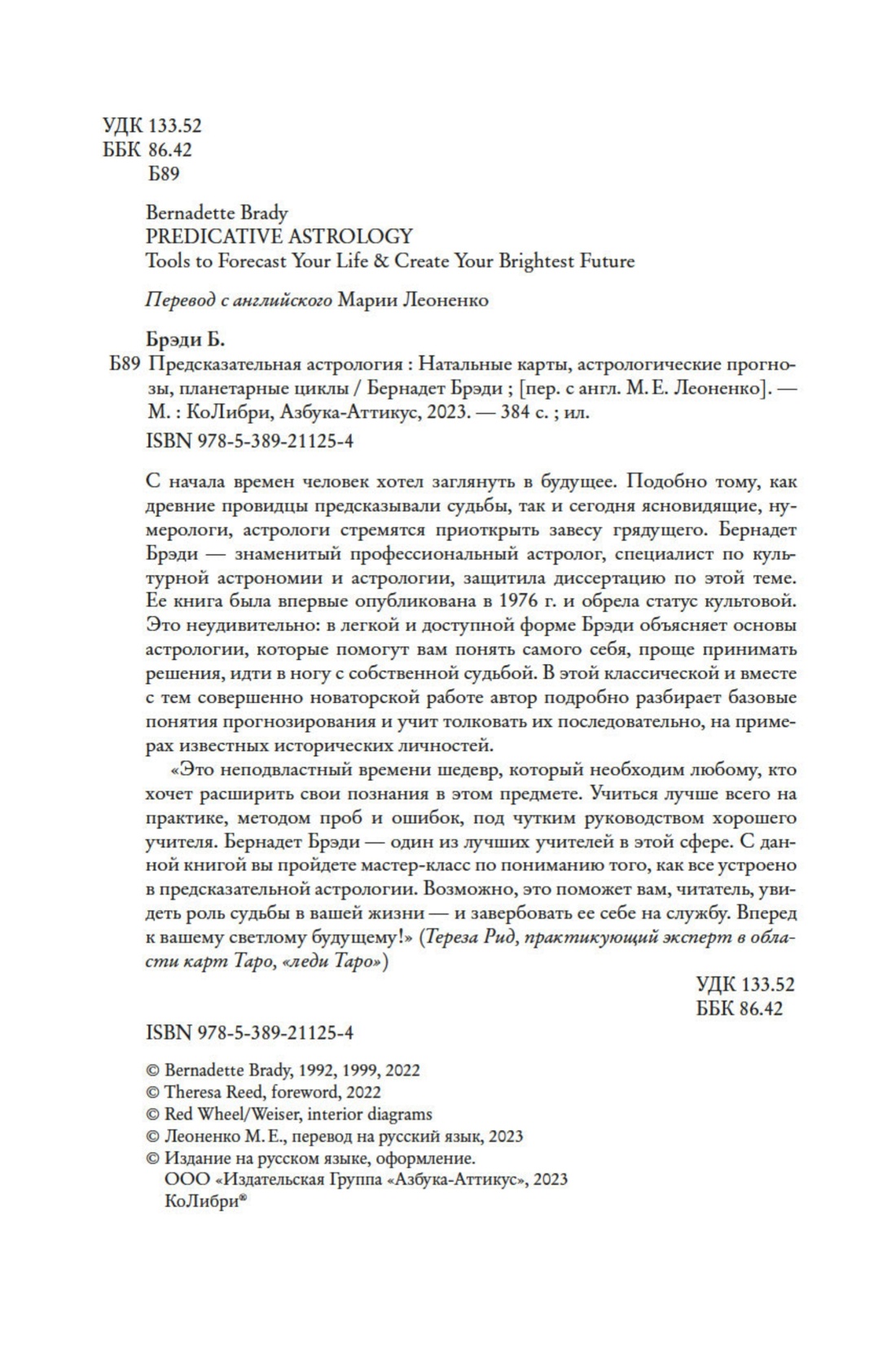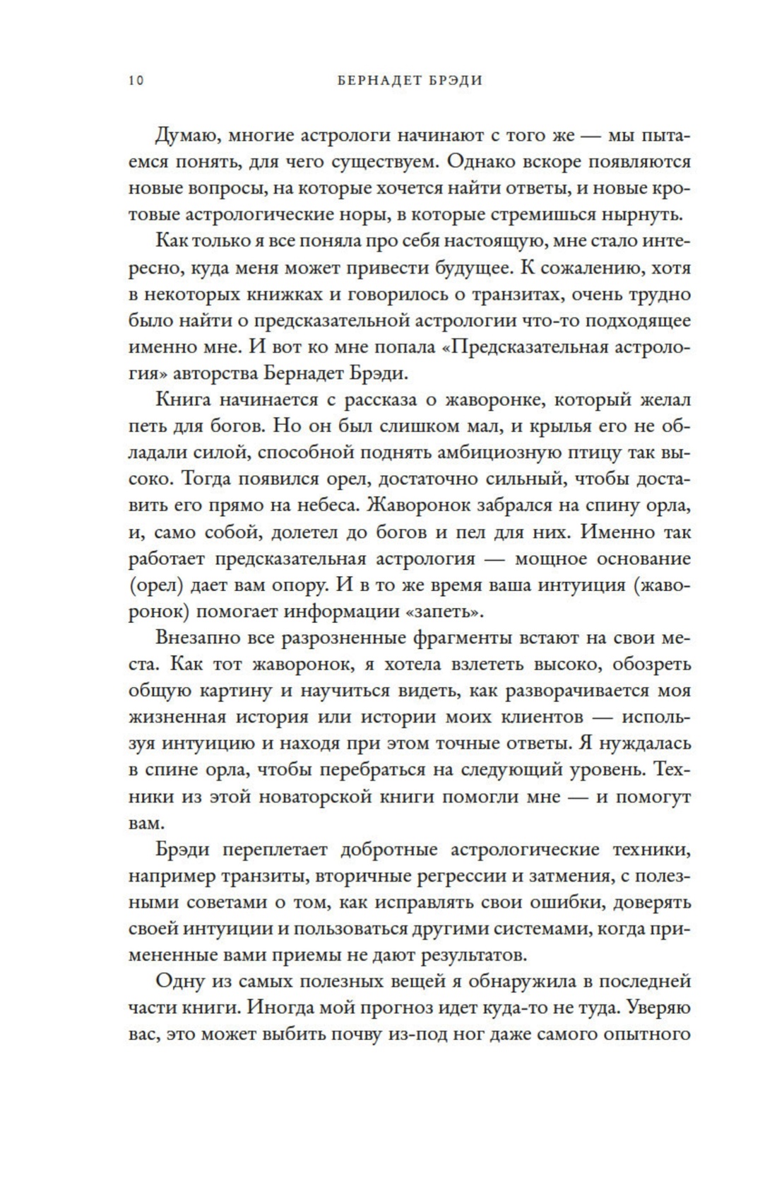 «Это неподвластный времени шедевр, который необходим любому, кто хочет расширить свои познания в этом предмете. Учиться лучше всего на практике, методом проб и ошибок, под чутким руководством хорошего учителя. Бернадет Брэди — один из лучших учителей в этой сфере. С данной книгой вы пройдете мастер-класс по пониманию того, как все устроено в предсказательной астрологии. Возможно, это поможет вам, читатель, увидеть роль судьбы в вашей жизни — и завербовать ее себе на службу. Вперед к вашему светлому будущему!» (Тереза Рид, практикующий эксперт в области карт Таро, «леди Таро»)